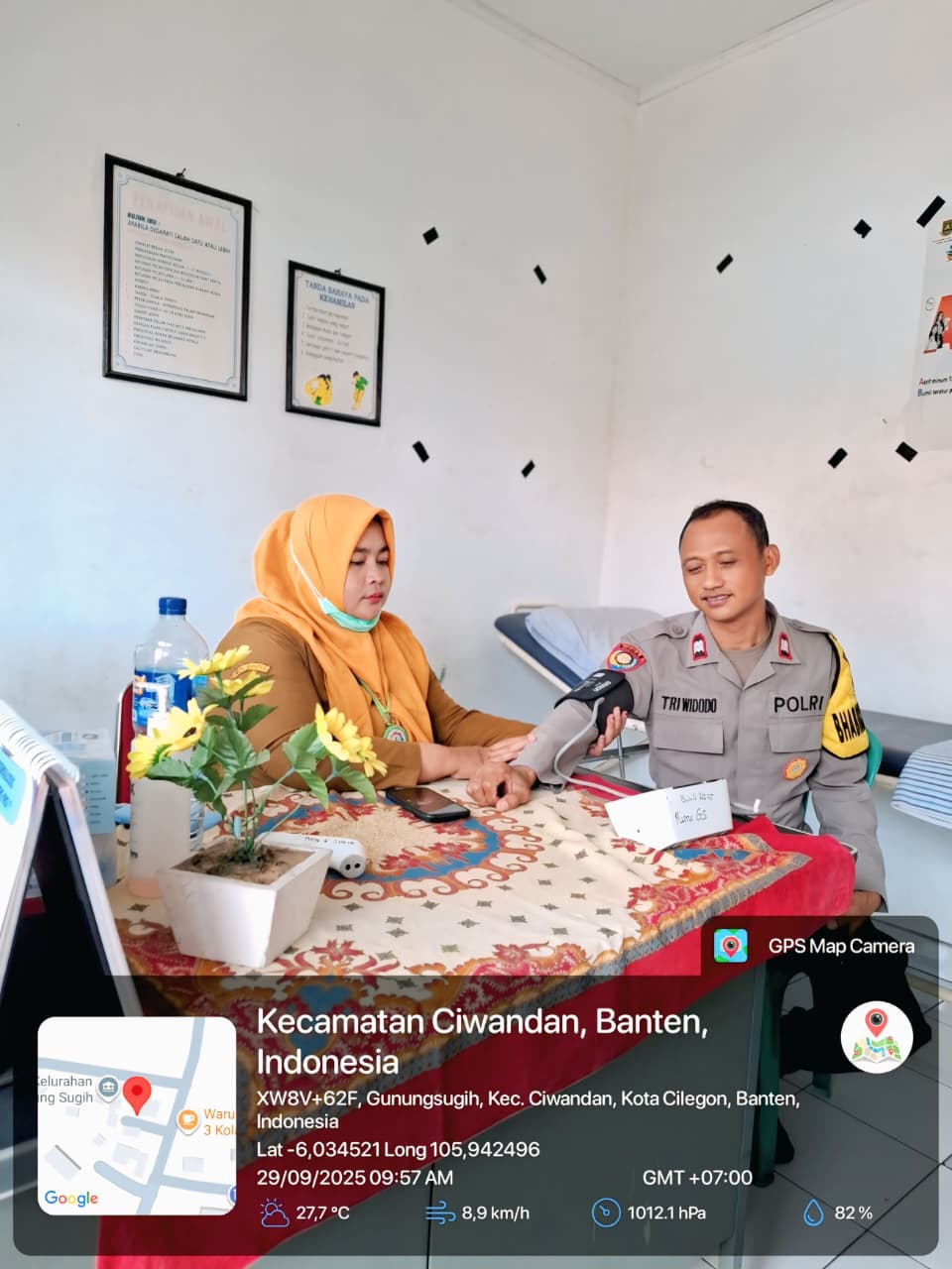 Cilegon - Dalam rangka mendukung program kesehatan masyarakat, Bhabinkamtibmas Kelurahan Gunung Sugih Polsek Ciwandan Polres Cilegon Polda Banten AIPTU Tri Widodo menyambangi kegiatan Dalam Rangka Memperingati Haru Tuberkulosis sedunia yang diselenggarakan di Lingkungan Kelurahan Gunung Sugih Kecamatan Ciwandan Kota Cilegon, (03/10/2025).