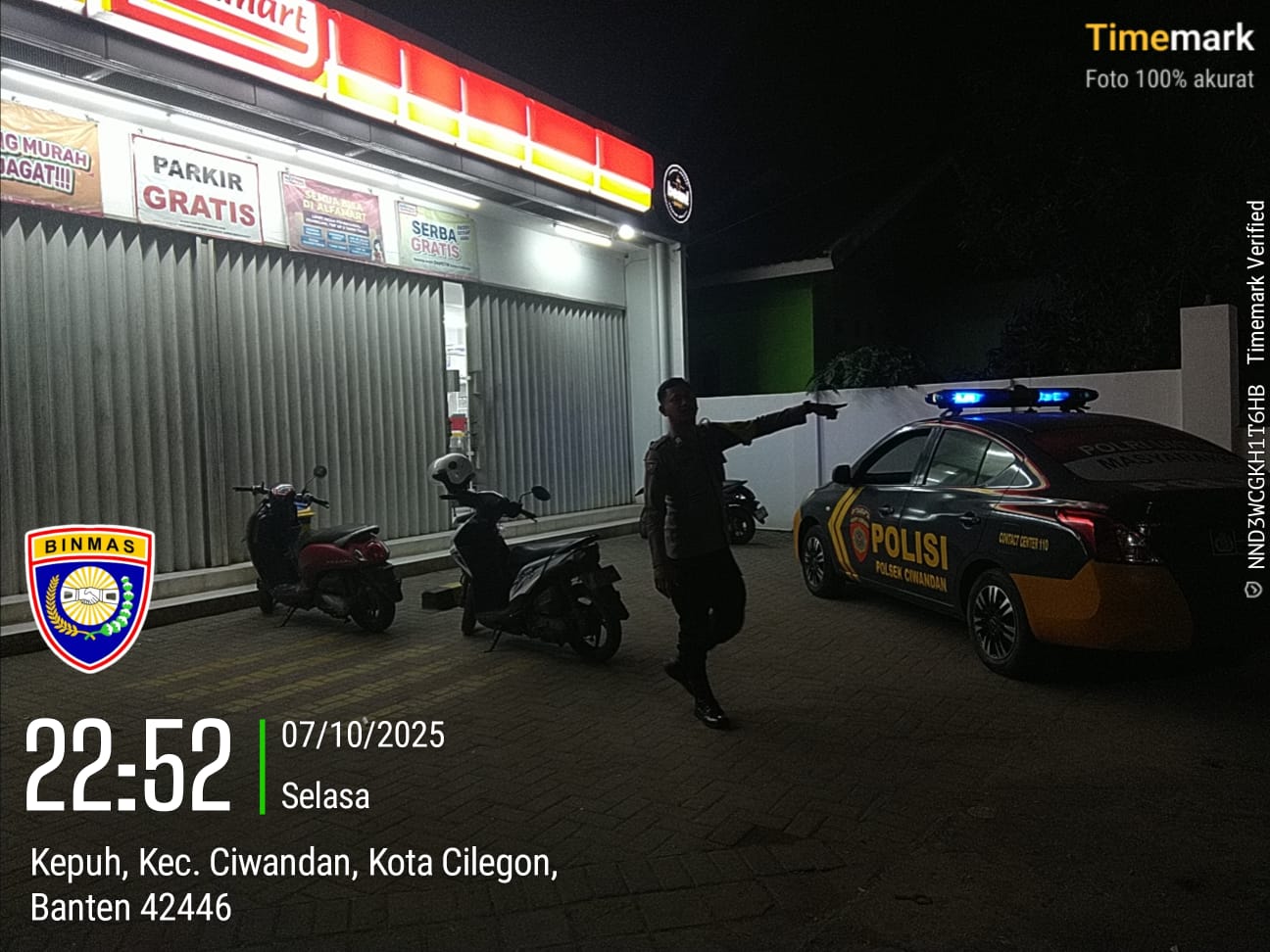 Cilegon - Personil Polsek Ciwandan Polres Cilegon Polda Banten melaksanakan patroli malam untuk mengantisipasi potensi kejahatan, khususnya pembobolan minimarket, di daerah hukum Polsek Ciwandan. Kegiatan ini bertujuan untuk meningkatkan keamanan dan memberikan rasa aman kepada masyarakat, Rabu (08/10/2025).