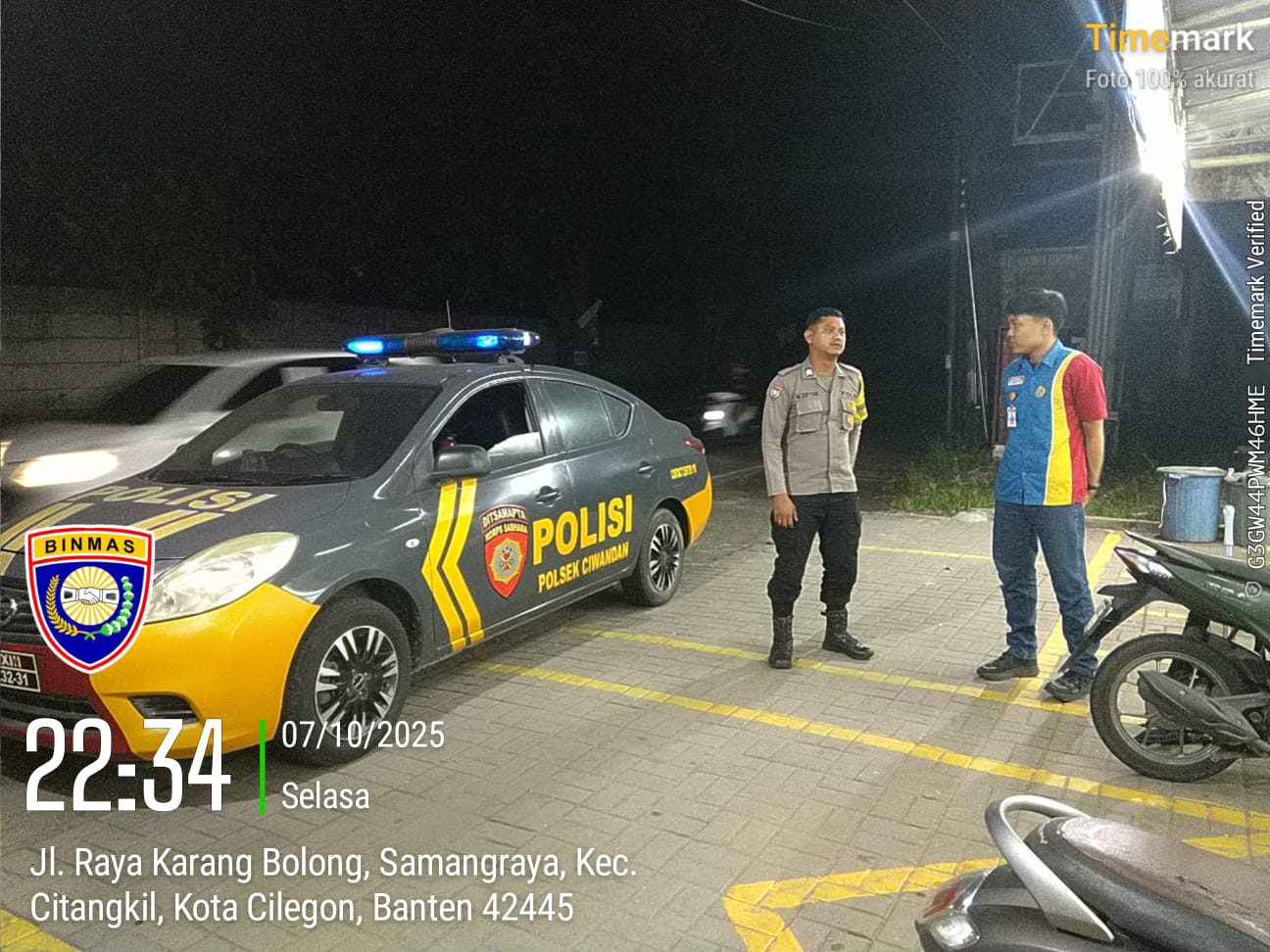 Cilegon - Personil Polsek Ciwandan Polres Cilegon Polda Banten melaksanakan patroli malam untuk mengantisipasi potensi kejahatan, khususnya pembobolan minimarket, di daerah hukum Polsek Ciwandan. Kegiatan ini bertujuan untuk meningkatkan keamanan dan memberikan rasa aman kepada masyarakat, Rabu (08/10/2025).