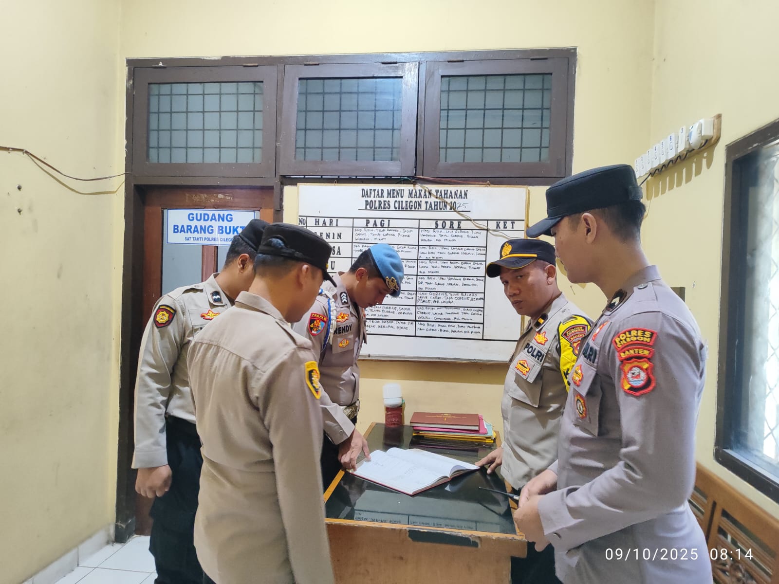 Cilegon, Polres Cilegon Polda Banten. Di gudang barang bukti Polres Cilegon. Kapolres Cilegon Polda Banten AKBP Dr. Martua Raja Taripar Laut Silitonga,S.H,.S.I.K.,M.Si Kepada Kasat Tahti Polres Cilegon Iptu Yudi Hartono mengingatkan agar anggota piket sattahti agar tetap terus kontrol barang bukti yang sudah dititipkan di sattahti polres cilegon.(09/10/2025)