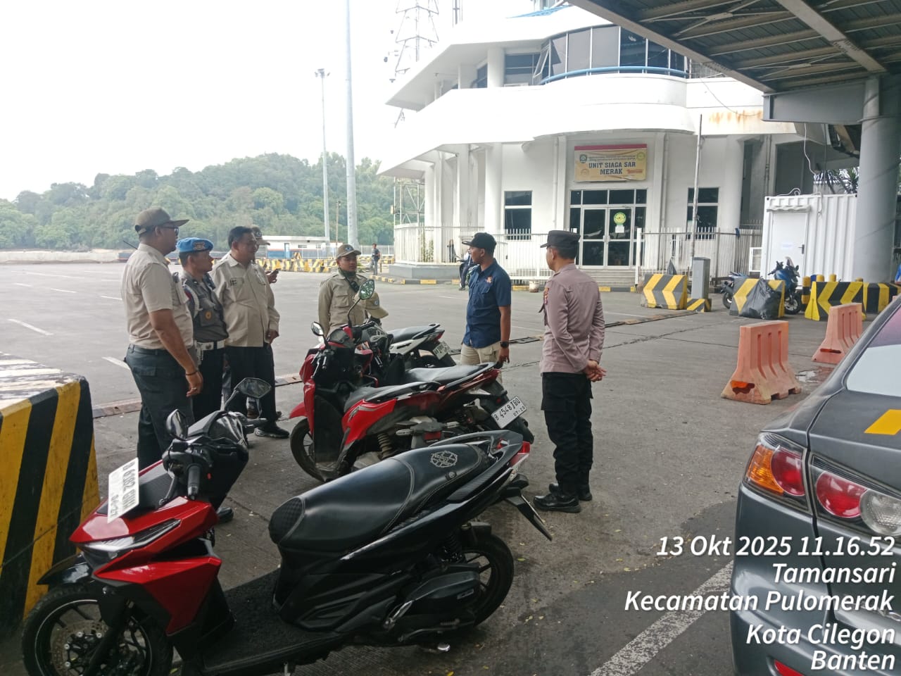 Cilegon - Personel Polsek Kskp Merak Polres Cilegon Polda Banten melaksanakan sambang dan patroli kawasan pelabuhan merak dalam rangka menjaga Harkamtibmas di Kawasan Pelabuhan Merak, Senin (13/10/2025).