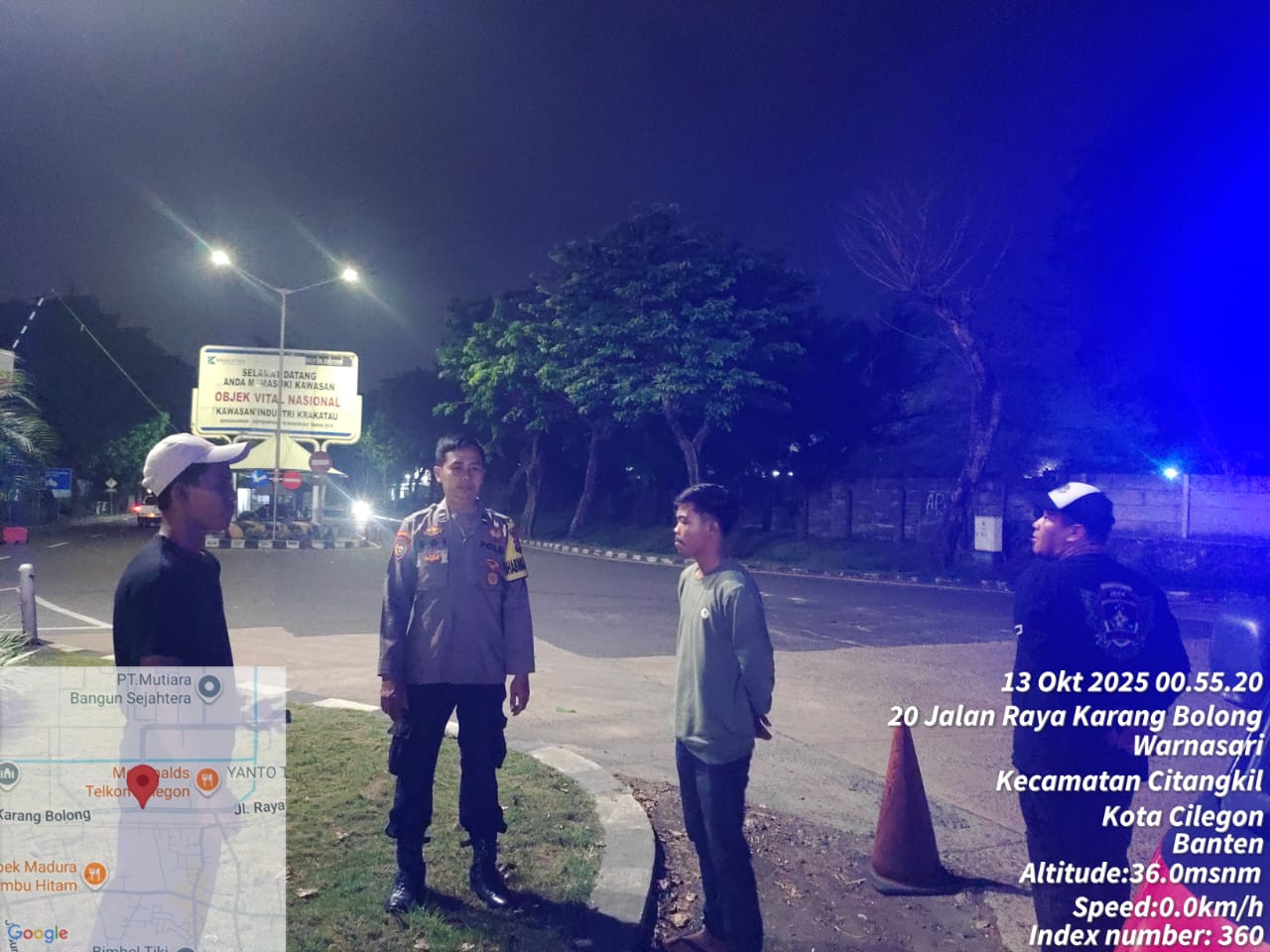 Cilegon - Personil Polsek Ciwandan Polres Cilegon Polda Banten Dalam Pelaksanaan Kegiatan Patroli dengan menyalakan lampu rotator berwarna biru di Daerah Hukum Polsek Ciwandan Polres Cilegon Polda Banten dari malam hingga dini hari, dalam rangka menciptakan situasi aman dan kondusif, Senin (13/10/2025).