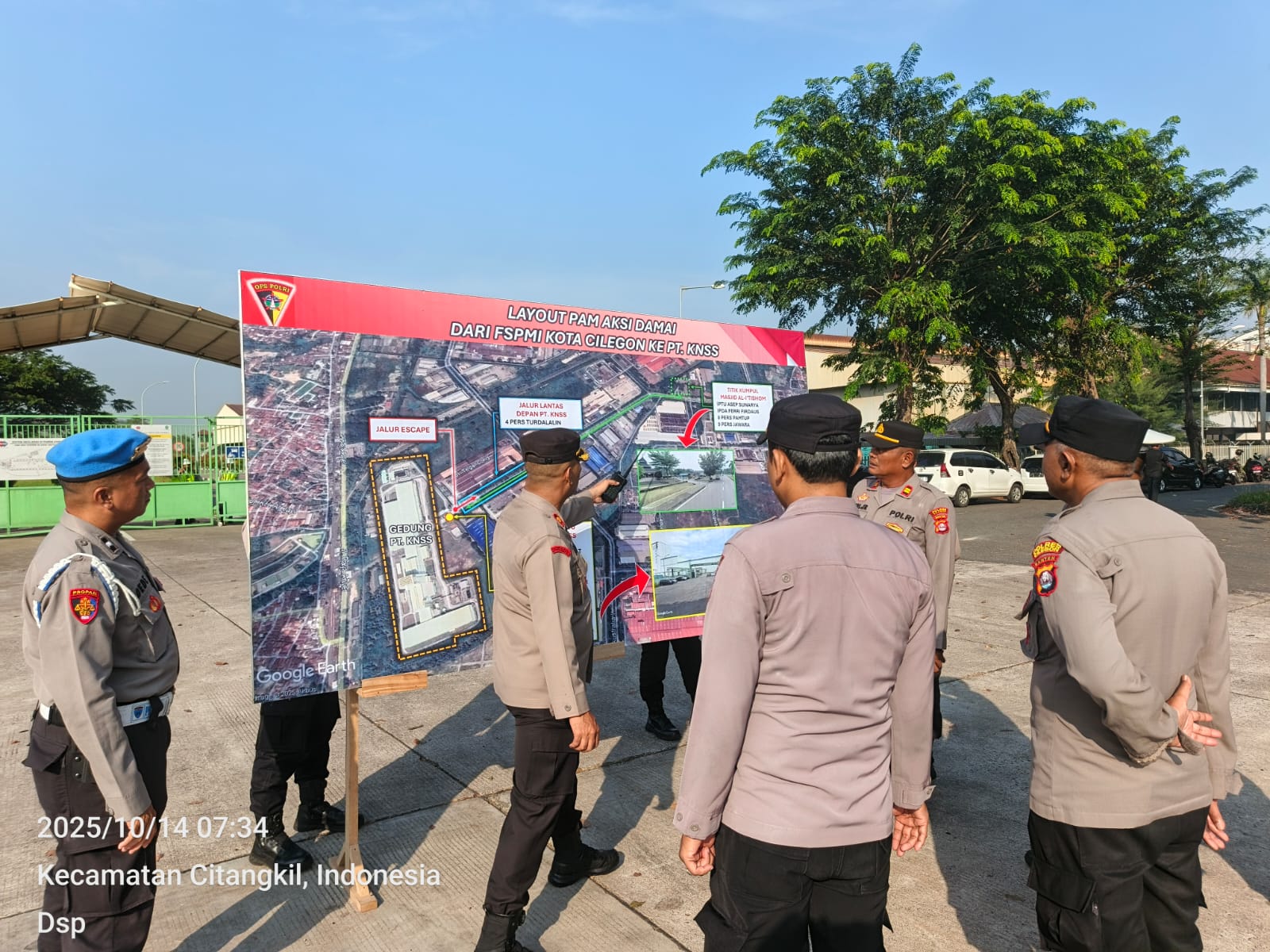 Cilegon - Kapolsek Ciwandan KOMPOL Andi Suherman Pimpin Apel pengamanan aksi damai dari Serikat Pekerja FSPMI Kota Cilegon ke PT. KNSS Cilegon pada Selasa, (14/10/2025).