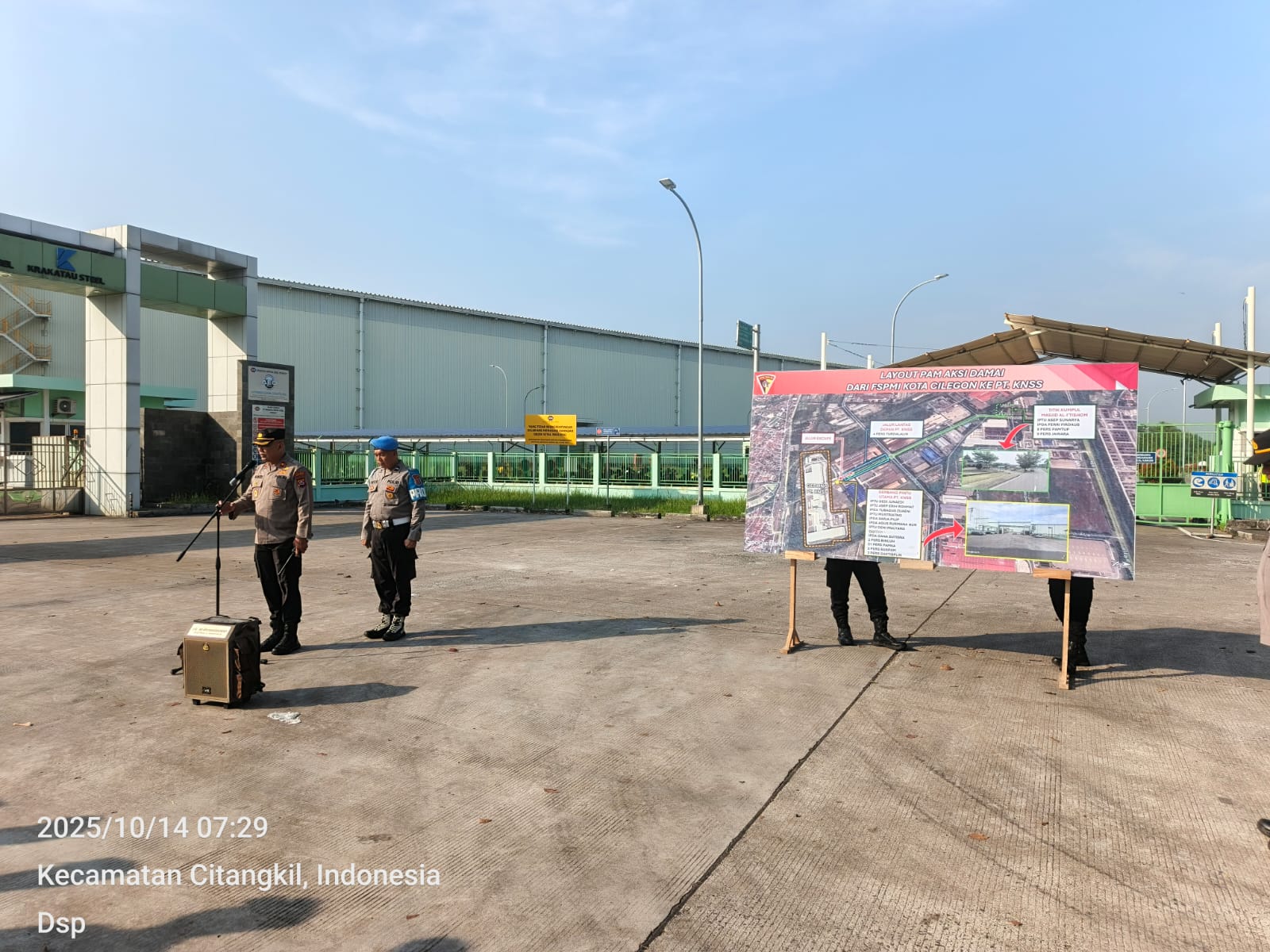 Cilegon -  Kapolsek Ciwandan KOMPOL Andi Suherman Pimpin Apel pengamanan aksi damai dari Serikat Pekerja FSPMI Kota Cilegon ke PT. KNSS Cilegon pada Selasa, (14/10/2025).