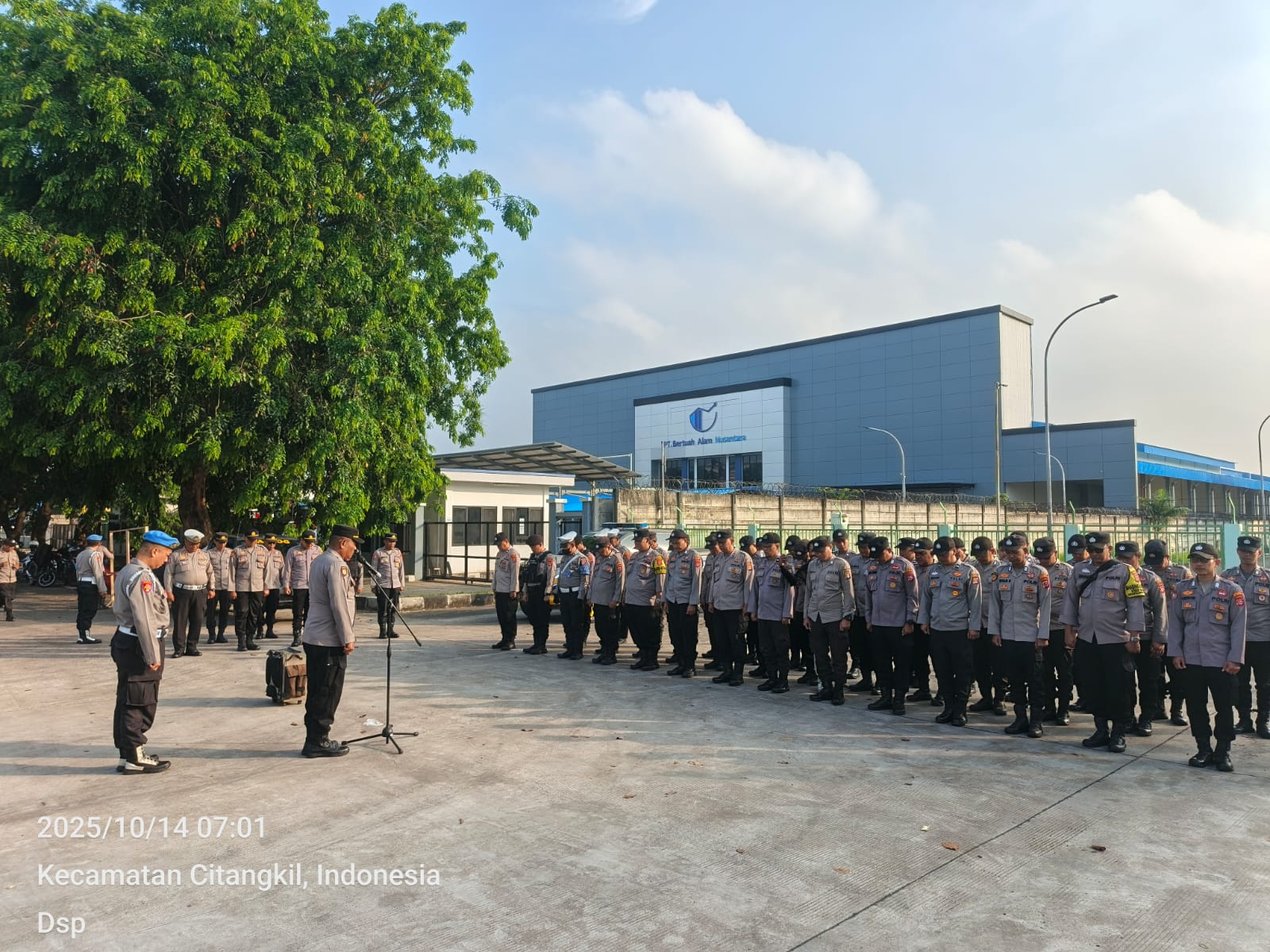 Cilegon -  Kapolsek Ciwandan KOMPOL Andi Suherman Pimpin Apel pengamanan aksi damai dari Serikat Pekerja FSPMI Kota Cilegon ke PT. KNSS Cilegon pada Selasa, (14/10/2025).