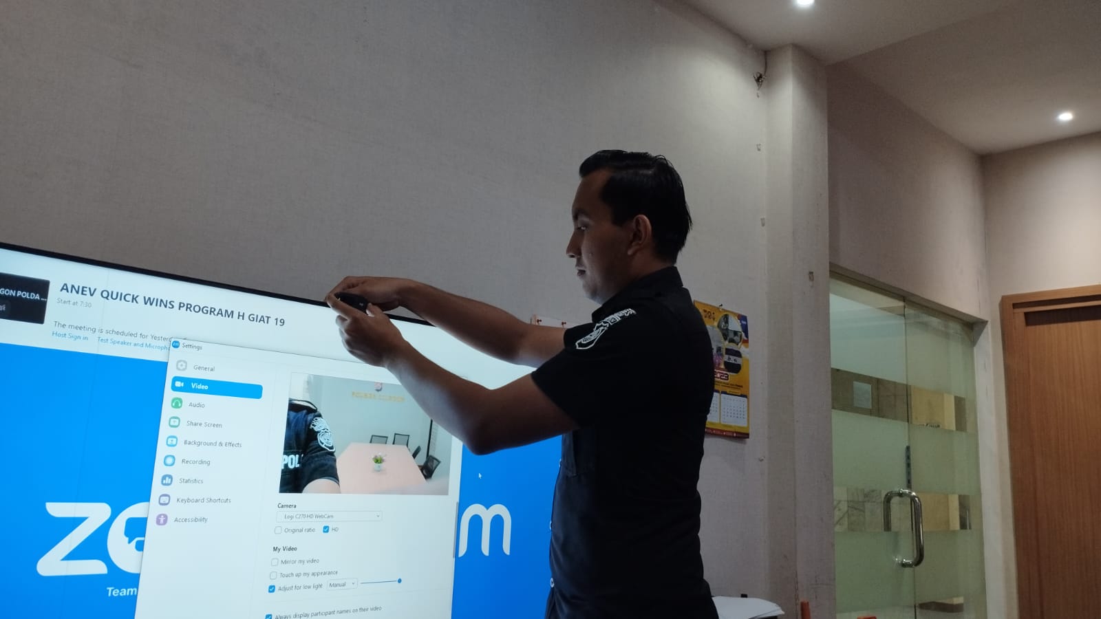 Anggota Tik Polres Cilegon Menyiapkan Sarana dan Prasarana Untuk Kegiatan Zoom meeting Dalam pelaksanaan kegiatan zoom meeting tersebut anggota TIK Polres Cilegon yang bertanggung jawab untuk menyiapkan peralatan zoom. Selain itu agar di tidak ada gangguan jaringan sebelum pelaksanaan anggota TIK melakukan pemeriksaan terhadap sarana dan prasarana tersebut . Satu jam sebelum kegiatan zoom meeting itu dimulai. Kapolres Cilegon AKBP. DR. MARTUA RAJA TARIPAR LAUT SILITONGA. melalui Kasi TIK IPTU Lukman menyampaikan bahwa “untuk menunjang kelancaran penyampaian informasi anggota TIk Polres Cilegon selalu memeriksa sarana dan prasarana tersebut, sebelum maupun pada saat pelaksanaan akan selalu di monitor”
