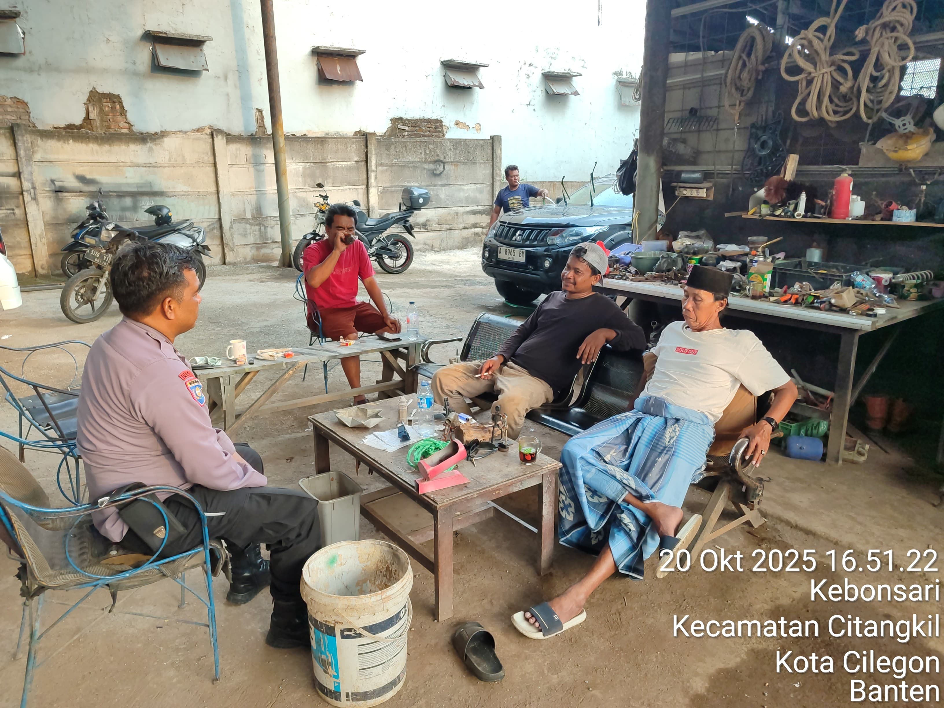 Cilegon – Bhabinkamtibmas Polsek Ciwandan Selalu Hadir Di Setiap Kegiatan warga binaanya merupakan salah satu tugas rutin Bhabinkamtibmas, yakni dengan melaksanakan kunjungan kepada masyarakat binaannya untuk menjalin silaturahmi yang lebih erat dan menyampaikan pesan-pesan kamtibmas serta mencari informasi yang berkembang di masyarakat agar tercipta situasi kamtibmas yang aman dan kondusif, Senin (20/10/2025).