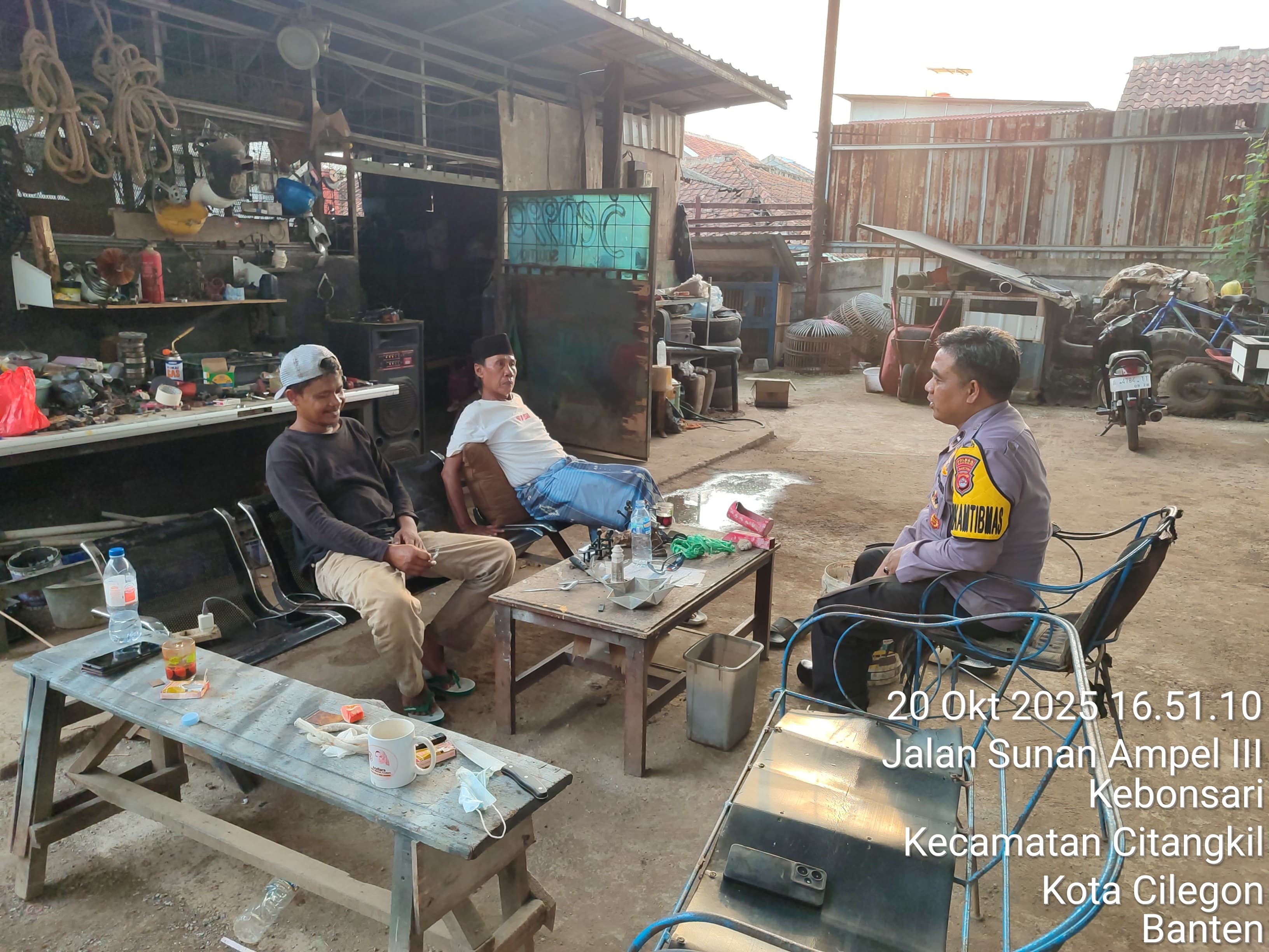 Cilegon – Bhabinkamtibmas Polsek Ciwandan Selalu Hadir Di Setiap Kegiatan warga binaanya merupakan salah satu tugas rutin Bhabinkamtibmas, yakni dengan melaksanakan kunjungan kepada masyarakat binaannya untuk menjalin silaturahmi yang lebih erat dan menyampaikan pesan-pesan kamtibmas serta mencari informasi yang berkembang di masyarakat agar tercipta situasi kamtibmas yang aman dan kondusif, Senin (20/10/2025).