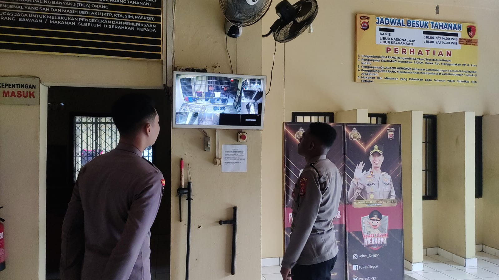 Personil Sat Tahti Cek Tahanan melalui CCTV yang ada di Rutan Polres Cilegon.