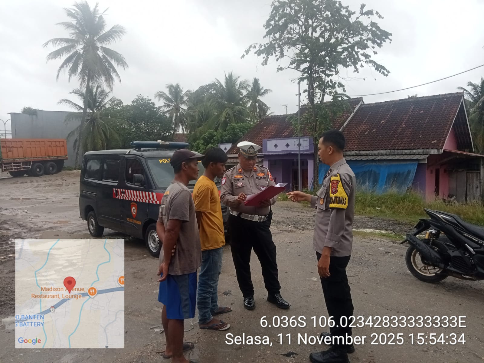 Personil yang mendampingi kegiatan ini adalah IPTU DENI MULYANA (Panit Lantas Polsek Ciwandan) dan AIPDA EDIANTO (Bhabinkamtibmas Kel. Tamanbaru). Mereka juga memberikan himbauan kepada masyarakat untuk selalu waspada dan berhati-hati saat beraktivitas.