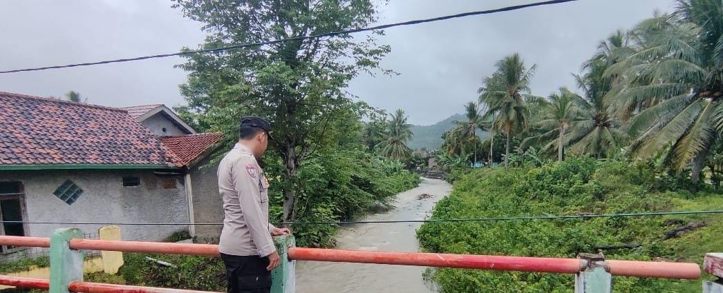 Personel Polsek Anyar Polres Cilegon Polda Banten melaksanakan Patroli kewilayahan mengecek debit air di Sungai pasca Hujan antisipasi banjir di wilayah Kec. Anyar, Selasa (09/12).