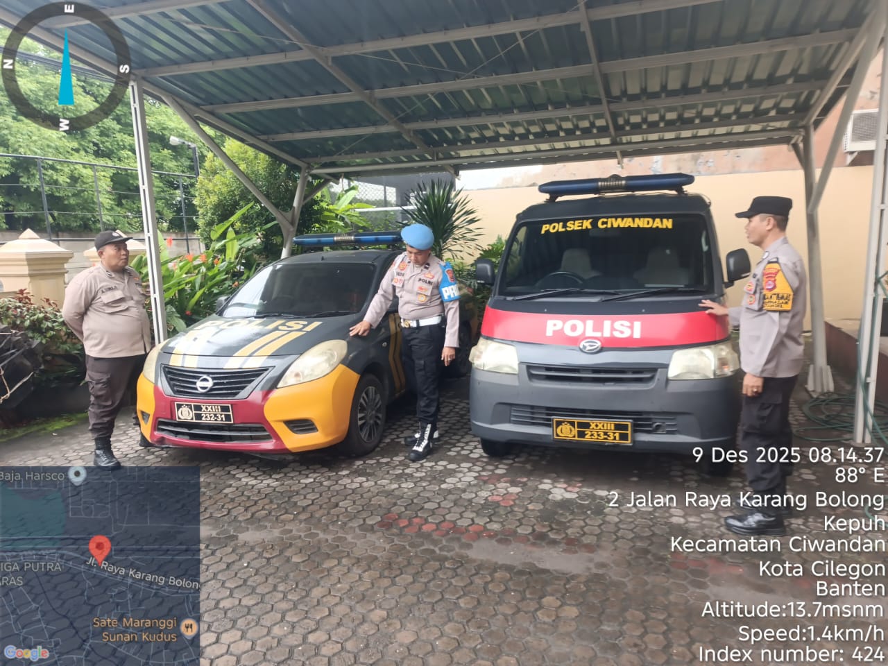 Cilegon - Ka SPKT Polsek Ciwandan Polres Cilegon Polda Banten Pimpin langsung pengecekan kendaraan Dinas Dan Inventaris Polsek Ciwandan Saat Serah terima Tugas Penjagaan, khususnya mobil patroli, Selasa (09/12/2025).
