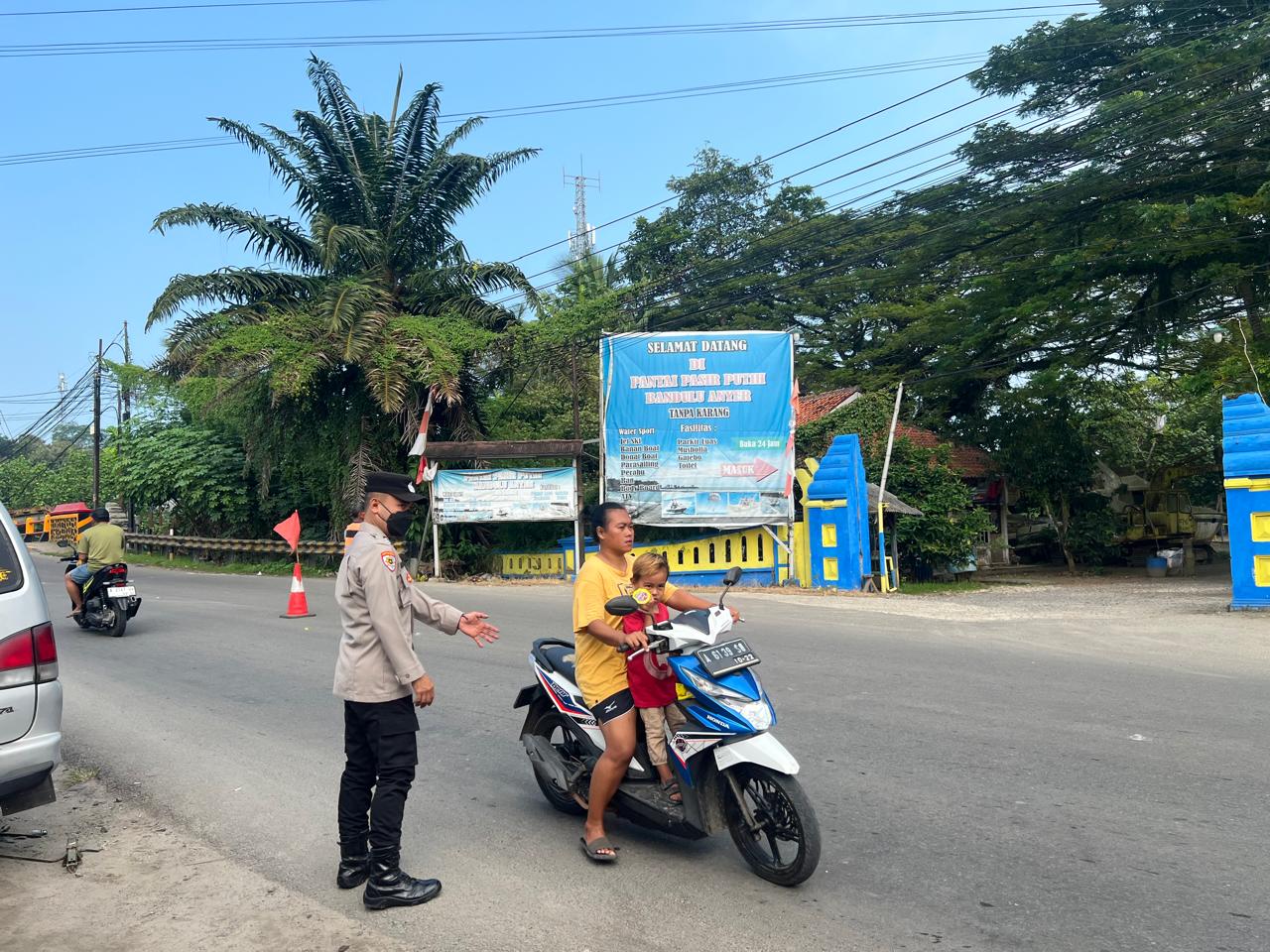 Anggota Polres Cilegon melaksanakan Pengaturan Arus Lalin atau Gatur Strong Point di arah jalur Wisata Pantai Anyer Banten.