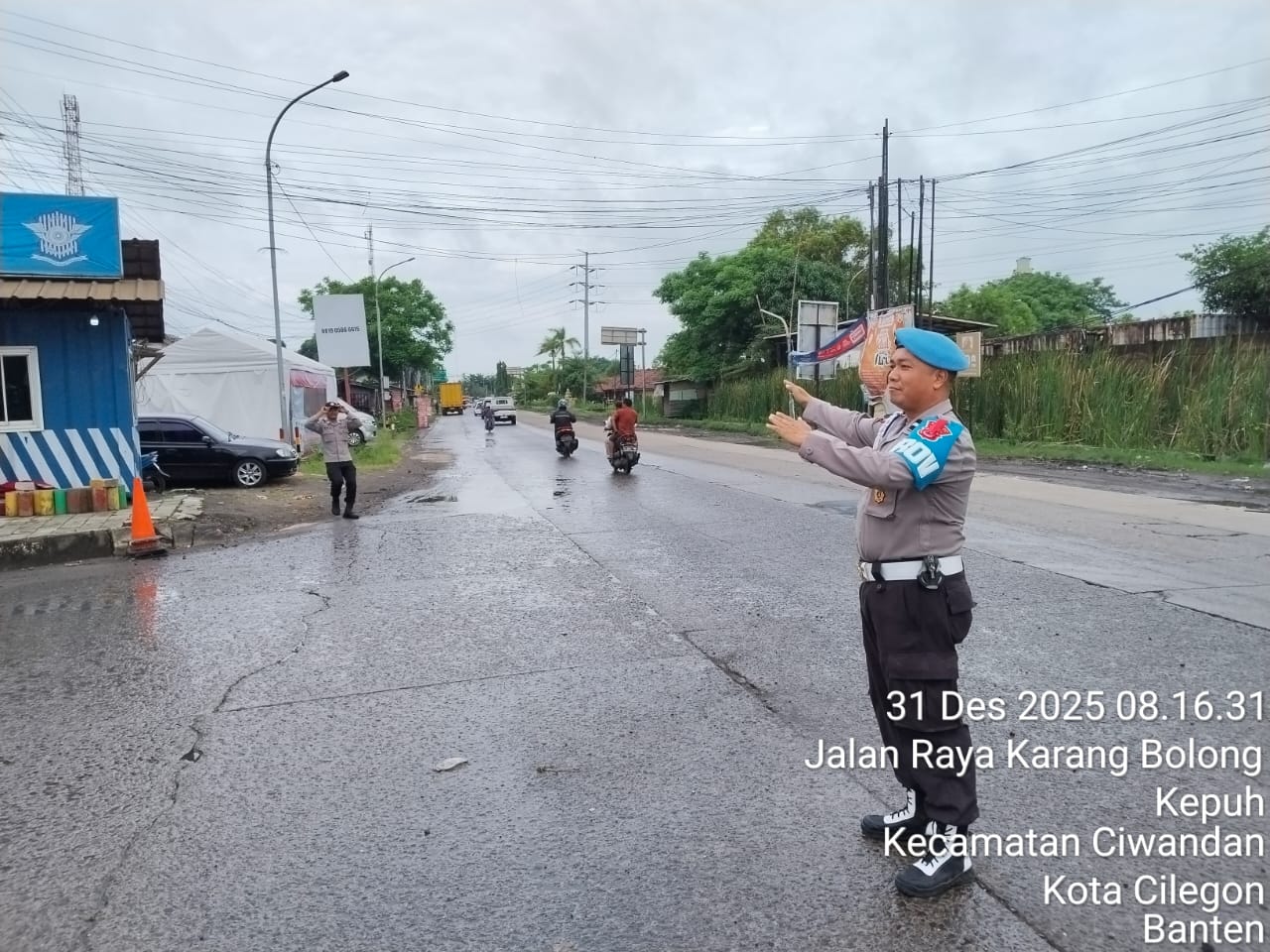 Cilegon - Personil Pos Pam 5 Polsek Ciwandan Polres Cilegon Polda Banten melaksanakan kegiatan pengaturan lalu-lintas dalam pengamanan Libur Natal 2025 Dan Tahun Baru 2026. Selasa (30/12/2025).