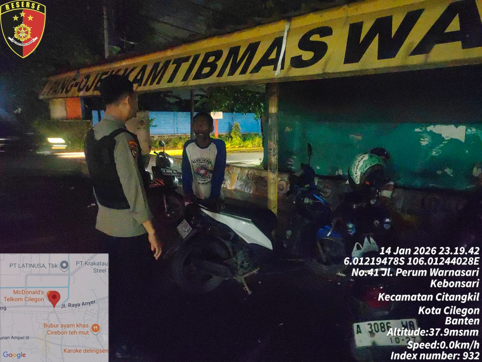 Cilegon - Guna mencegah gangguan kamtibmas, Personil Polsek Ciwandan Polres Cilegon Polda Banten melaksanakan giat Patroli dialogis dipangkalan Ojek (Opang) Pertigaan Simpang Warnasari Kelurahan warnasari kecamatan Citangkil, Kamis (15/01/2026).