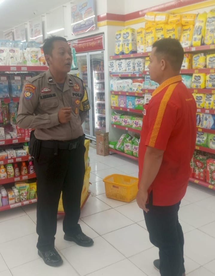 Personil Bhabinkamtibmas Laksanakan Patroli Dialogis di siang hari Menyapa Karyawan Alfamart dan menyampaikan himbauan kamtibmas