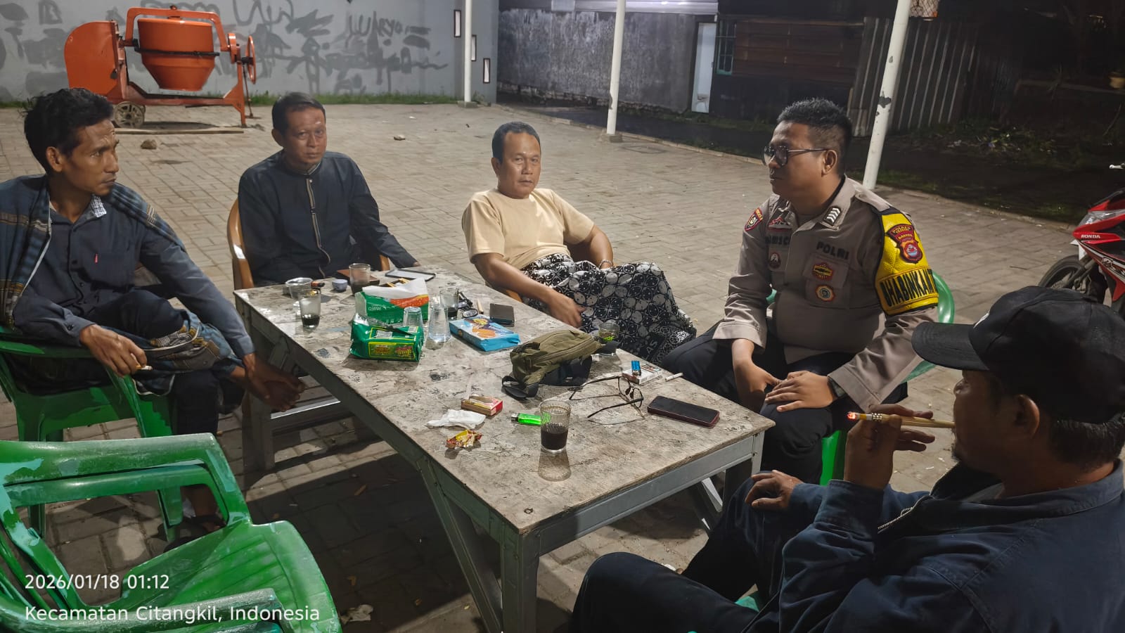 Cilegon - Bhabinkamtibmas Polsek Ciwandan Polres Cilegon Polda Banten Melaksanakan Patroli Kunjungan Malam dan terus memberikan pembinaan dan penyuluhan tentang pentingnya menjaga kamtibmas di daerah hukum Polsek Ciwandan Polres Cilegon Polda Banten, Minggu (18/01/2026).