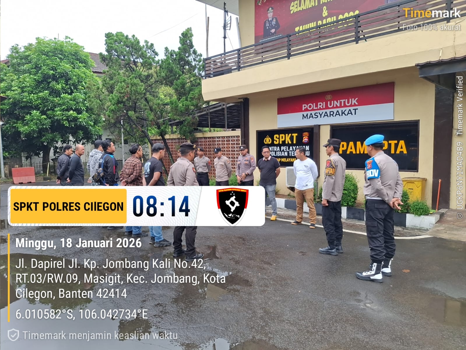 Cilegon, personel Satreskrim Polres Cilegon Polda Banten melaksanakan piket di penjagaan pintu masuk Polres Cilegon Polda Banten untuk memastikan mako Polres Cilegon dalam keadaan aman dan nyaman dalam melayani Masyarakat tanpa adanya gangguan kejahatan. Minggu (18/01/2026).