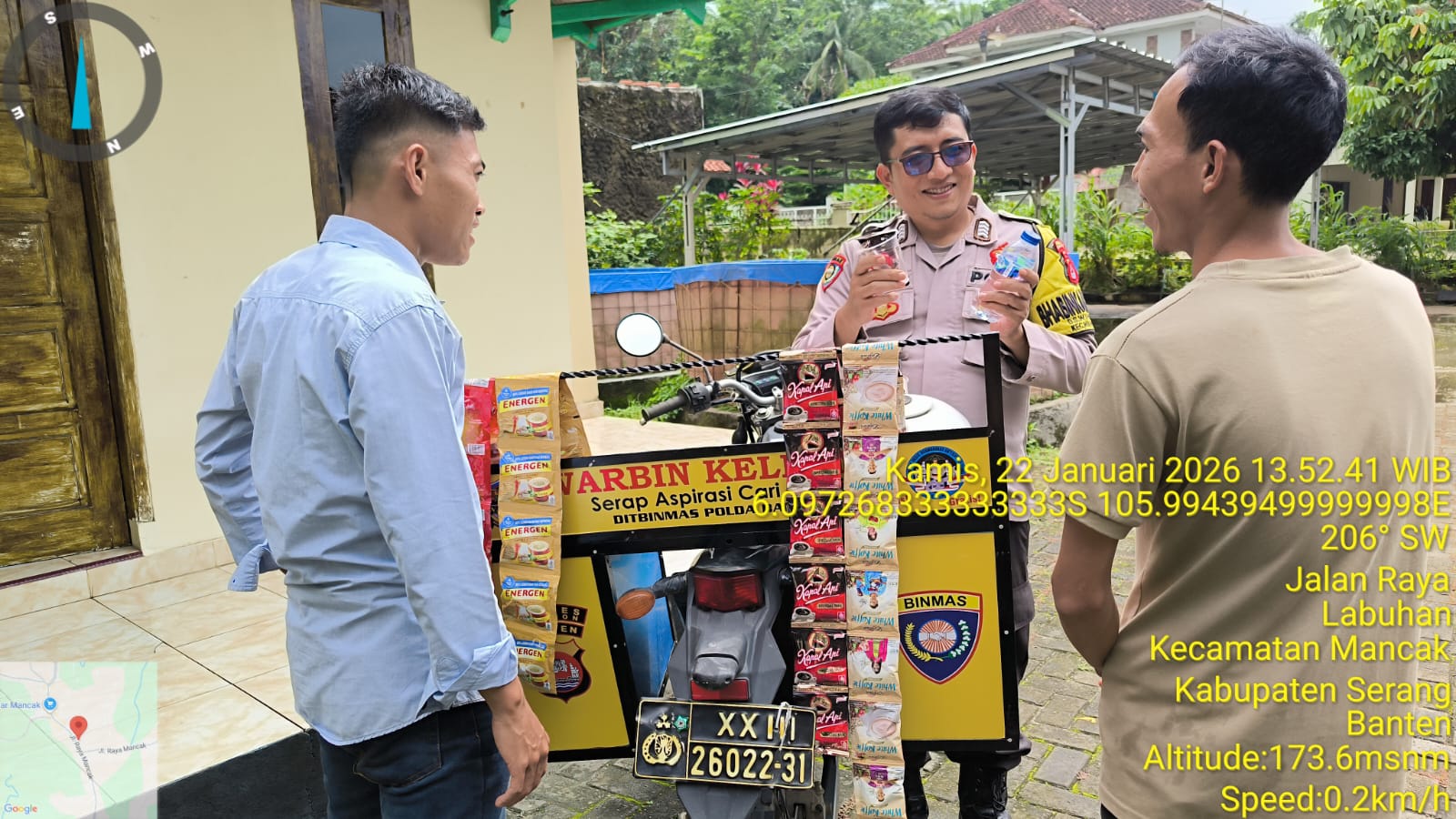 Kapolres Cilegon Polda Banten AKBP Dr. Martua Raja Taripar Laut Silitonga melalui Kapolsek Mancak  AKP ANDI AAS  MARIO Dan  Anggota Bhabinkamtibmas  BRIPKA ARIE SUFRIYADI, BRIGADIR ASEP WINDU SAPUTRA melaksanakan kegiatan sambang serta implementasi Commander Wish Kapolda Banten "WARBINLING" Warung Bhabinkamtibmas Keliling dan Program Commanderwish Kapolres Cilegon "TRENDING" dalam rangka menciptakan situasi aman dan kondusif di daerah hukum Polsek Mancak Polres Cilegon.
