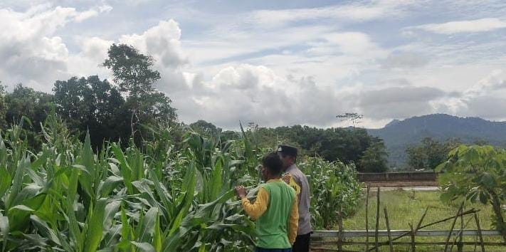 Dalam kegiatan monitoring ini, Bhabinkamtibmas meninjau langsung kondisi lahan jagung.