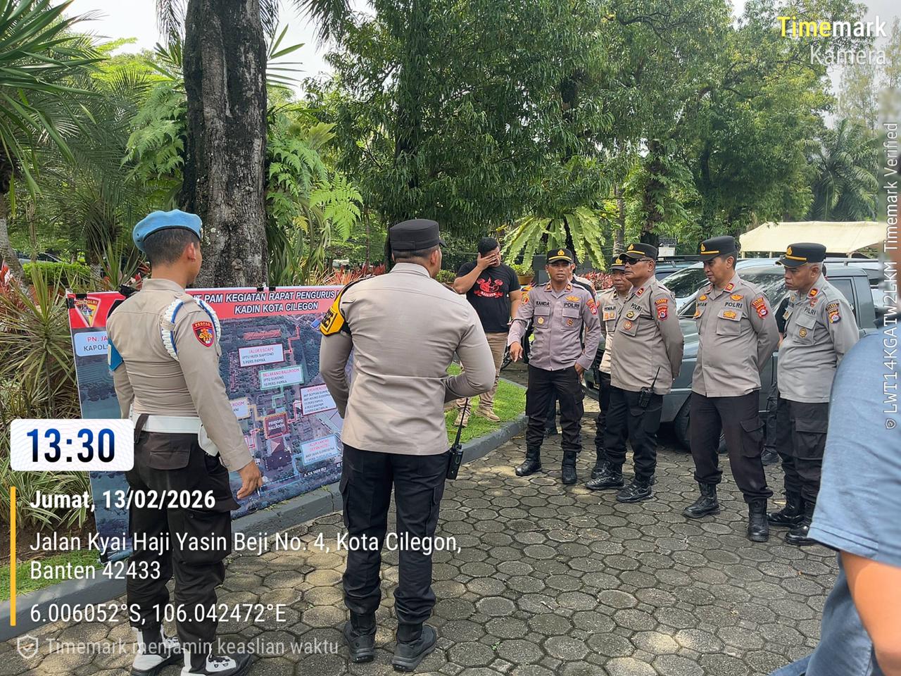 Polres Cilegon melaksanakan apel pengamanan dalam rangka kegiatan Rapat Pengurus Lengkap Kadin Kota Cilegon yang digelar di Ballroom Hotel The Royale Krakatau. Apel tersebut dipimpin oleh perwira pengendali dan diikuti oleh personel yang terlibat dalam surat perintah pengamanan.