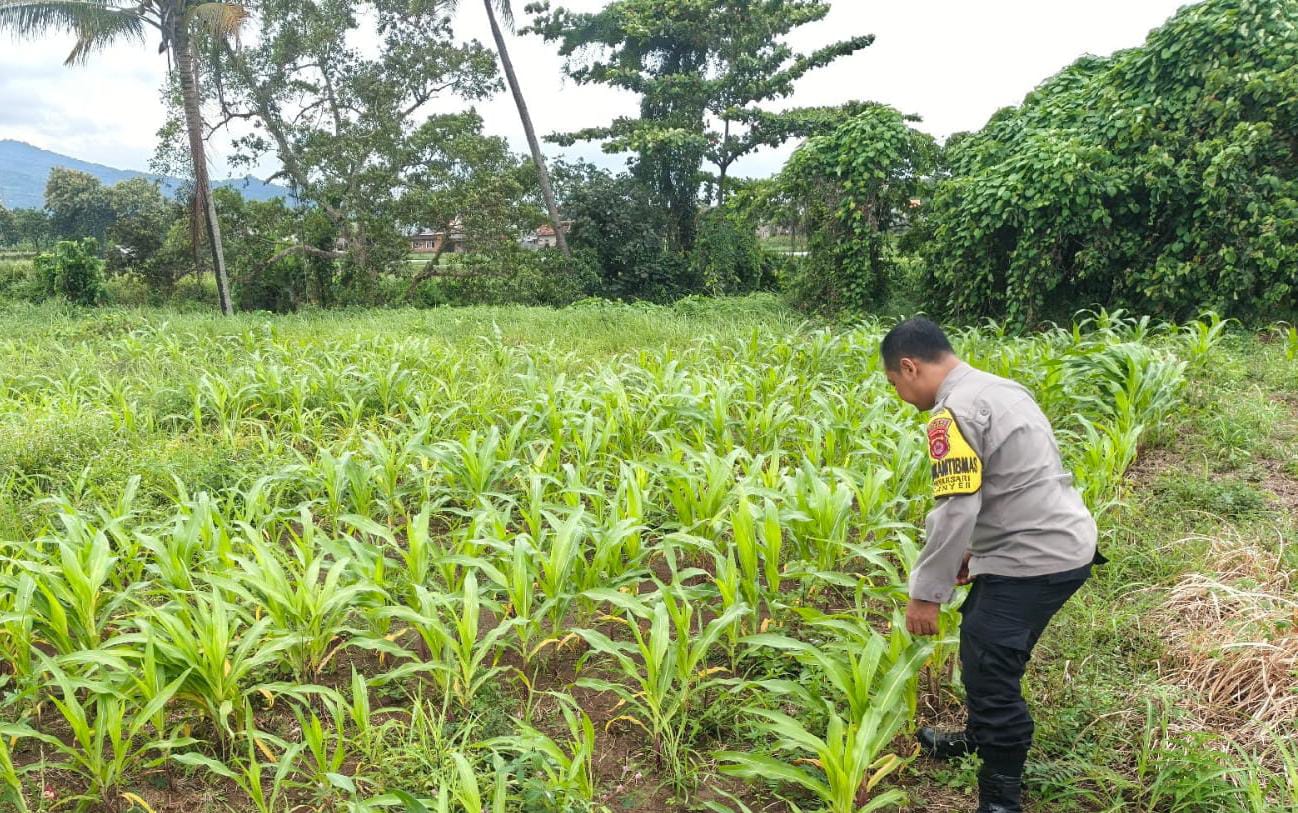 Dalam kegiatan monitoring ini, Bhabinkamtibmas meninjau langsung kondisi lahan jagung.