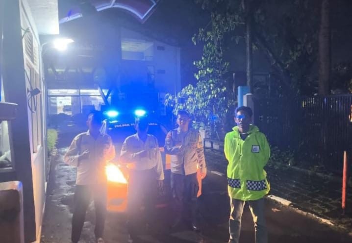 Bhabinkamtibmas Bripka Agustoni dari Polsek Purwakarta melaksanakan patroli dialogis dengan menyapa dan berbincang langsung dengan petugas keamanan (satpam) yang menjaga malam di Kantor Imigrasi Kelas II TPI Cilegon