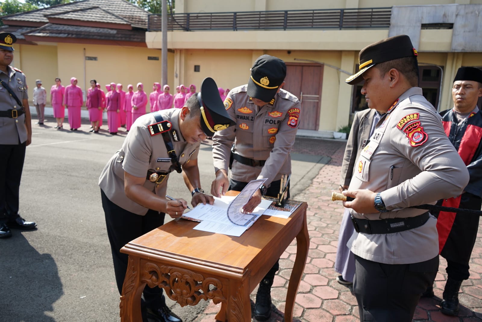 serah terima jabatan tiga kapolsek, dihadiri oleh jajaran Pejabat Utama, Kapolsek Jajaran serta Ketua dan Pengurus Bhayangkari Cabang Cilegon