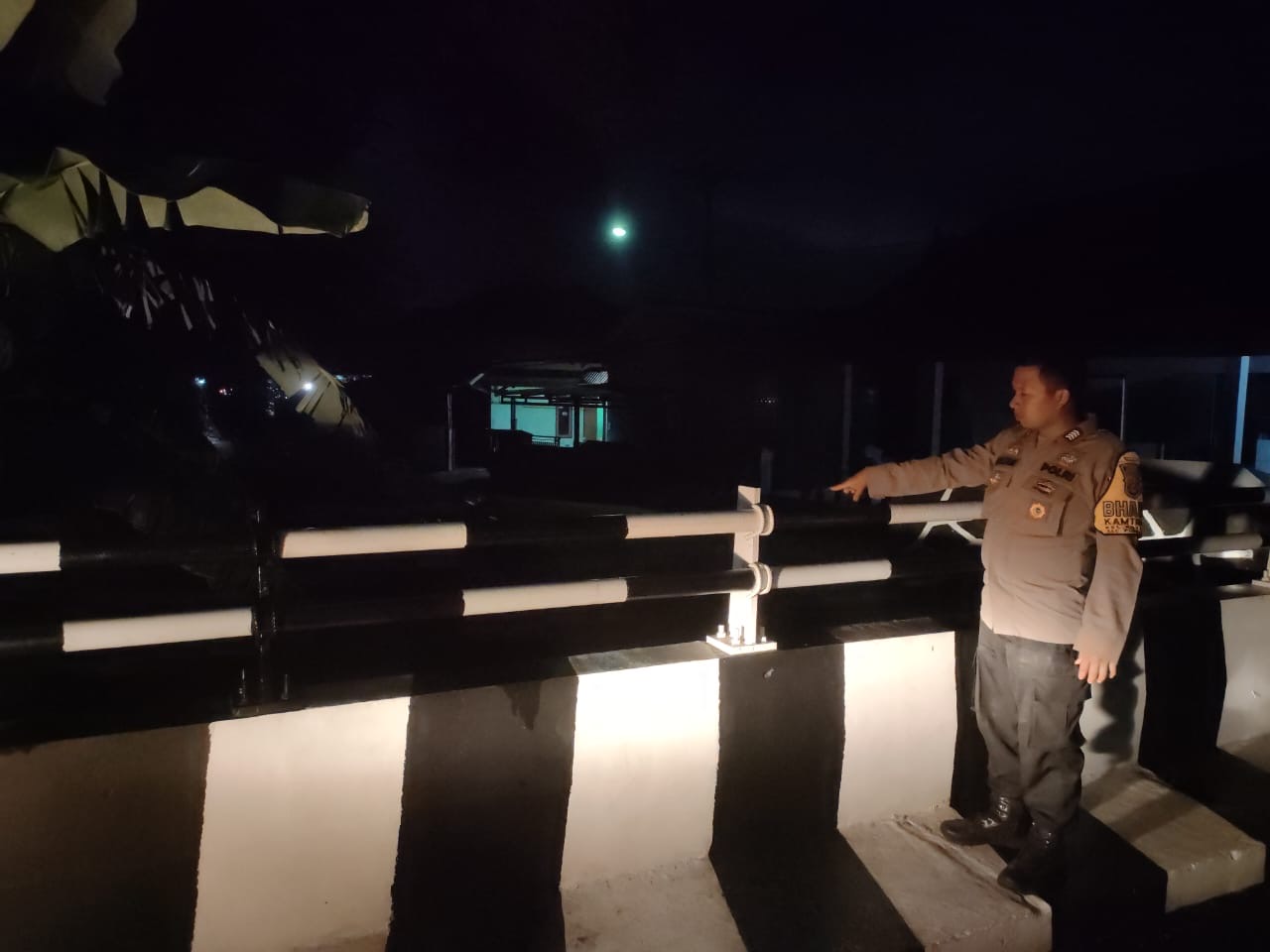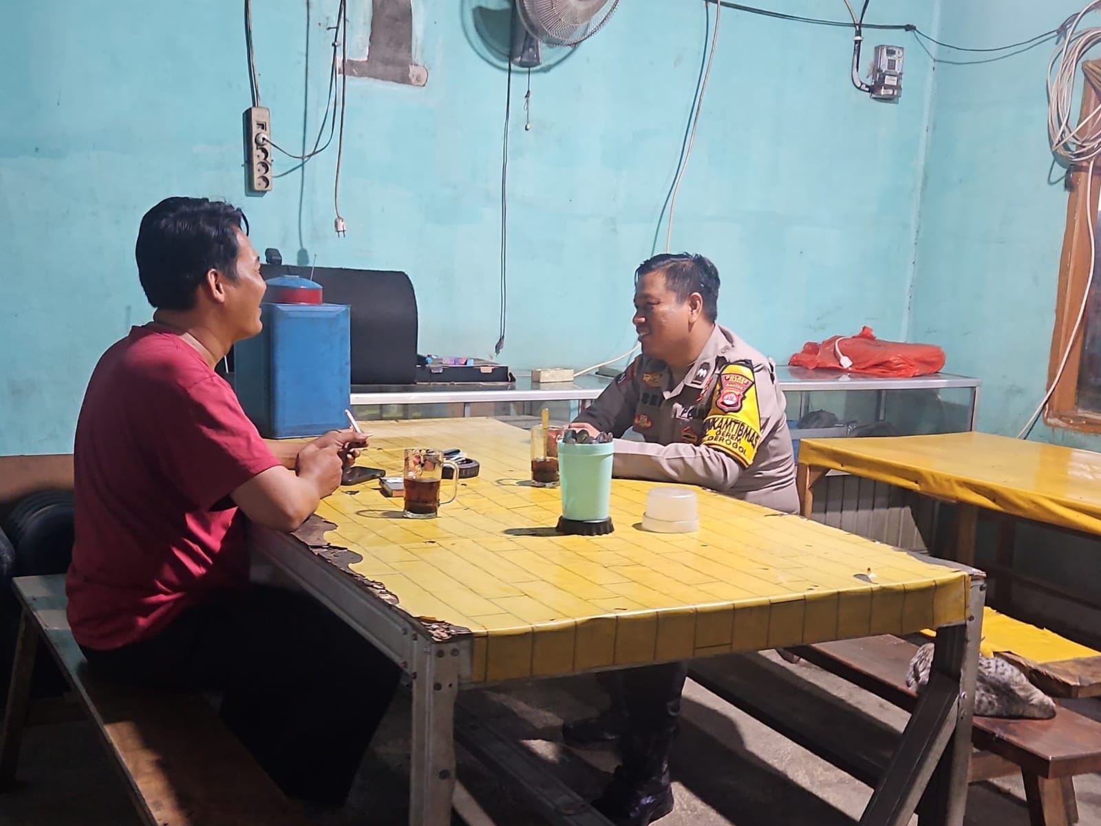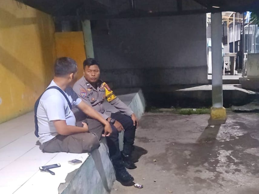 Bhabinkamtibmas Kelurahan Kotabumi, Bripka Agustoni, melakukan kunjungan ke Pos Ronda Lingkungan Penyairan untuk menyapa warga dan menyampaikan himbauan keamanan, ketertiban masyarakat (kamtibmas) serta informasi cuaca terkini