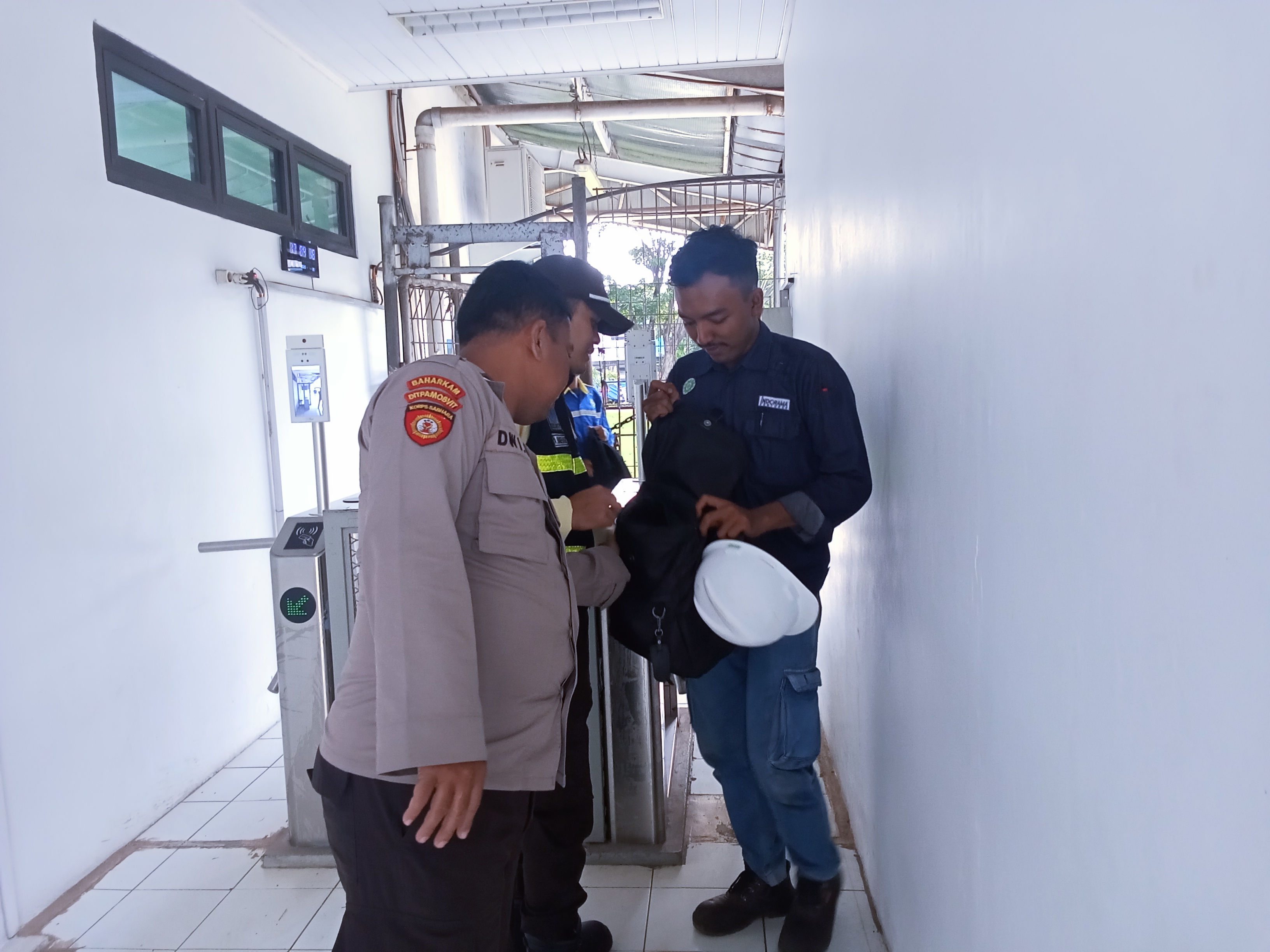 Anggota satpamobvit polres Cilegon Polda Banten memberikan himbauan kepada petugas scurty PT indorama Petrochemicals Cilegon Banten