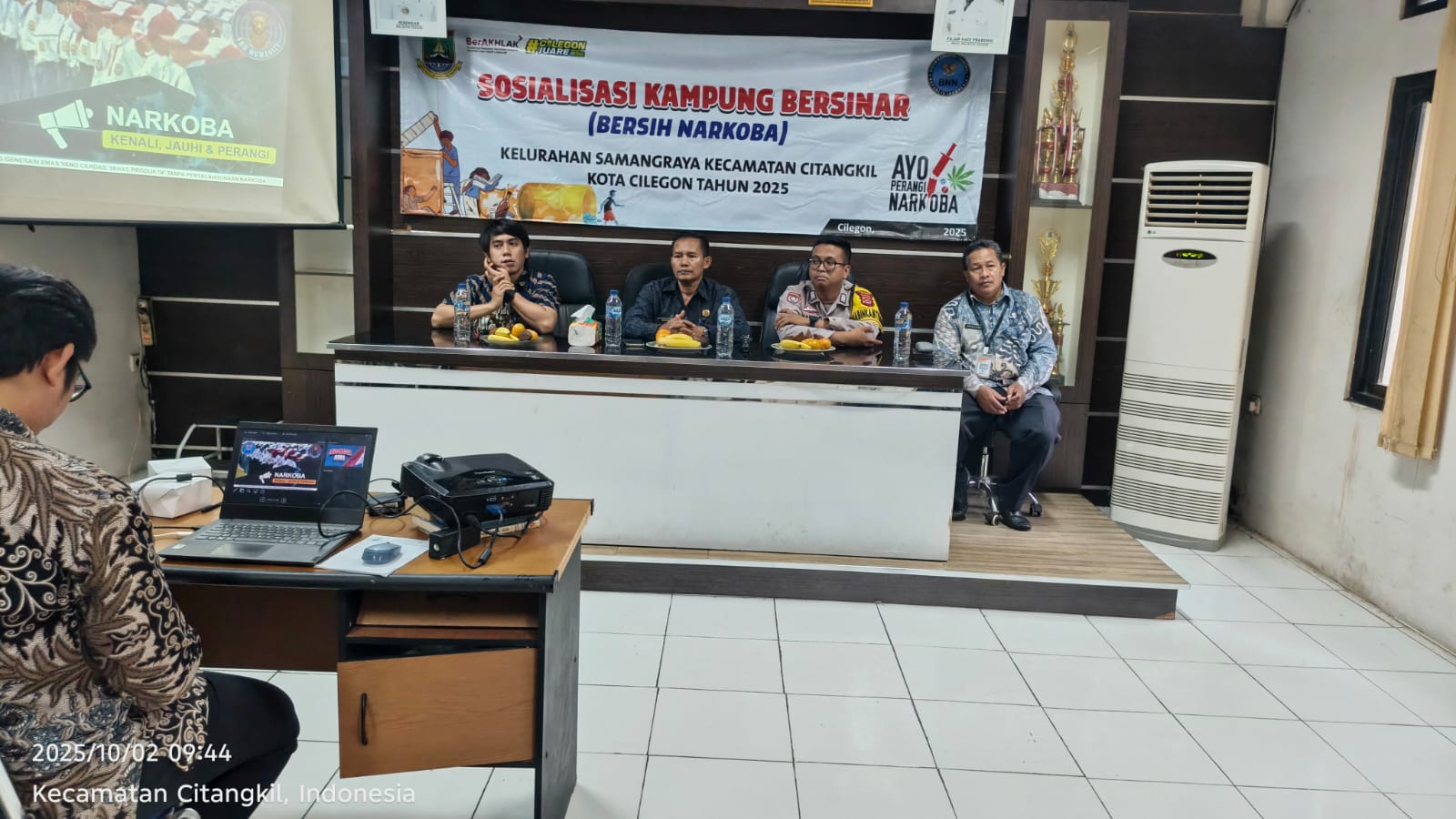 Cilegon - Bertempat di Aula Kantor Kelurahan Samangraya, Bhabinkamtibmas Kelurahan Samangraya Polsek Ciwandan Polres Cilegon Polda Banten BRIPKA Asep Karyudin Hadiri Sosialisasi Kampung Bersih Narkoba (Bersinar), Kamis (02/10/202).