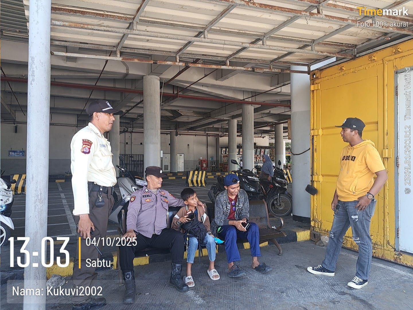 Cilegon - Personel Polsek Kskp Merak Polres Cilegon Polda Banten melaksanakan sambang dan patroli kawasan pelabuhan merak dalam rangka menjaga Harkamtibmas di Kawasan Pelabuhan Merak, Sabtu (04/10/2025).