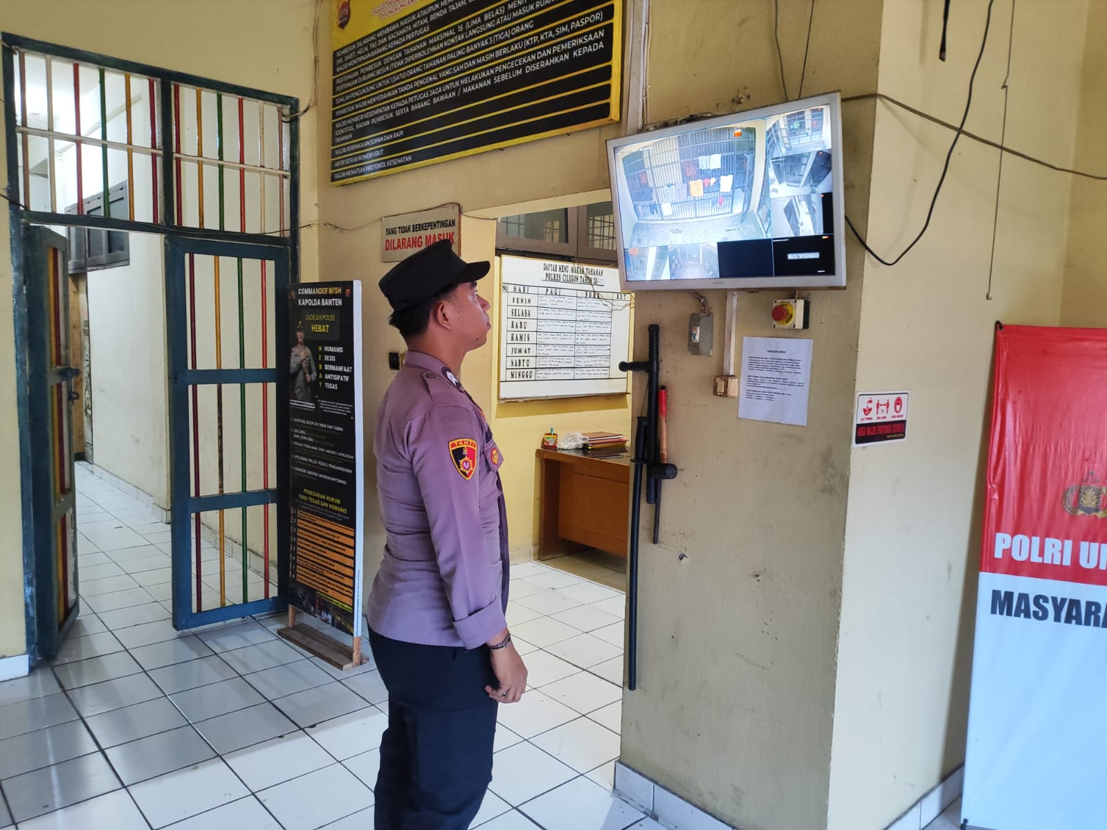Personil Sat Tahti Cek Tahanan melalui CCTV yang ada di Rutan Polres Cilegon.
