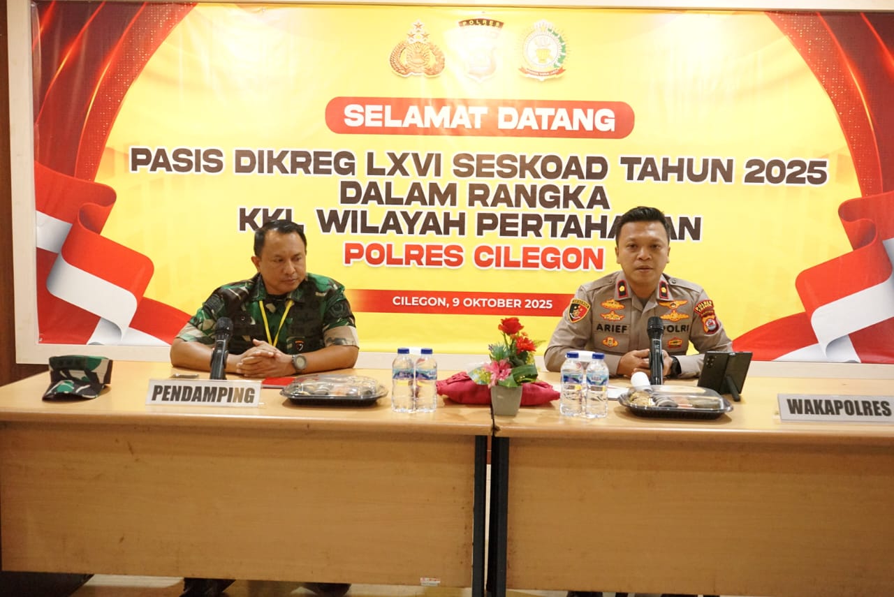 Cilegon – Polres Cilegon Polda Banten menerima kunjungan kegiatan Kuliah Kerja Lapangan (KKL) Perwira Siswa (Pasis) Pendidikan Reguler (Dikreg) LXVI Sekolah Staf dan Komando Angkatan Darat (Seskoad) Tahun 2025, Kegiatan yang berlangsung di Rupatama Polres Cilegon ini menjadi wadah penting untuk memperkuat sinergitas antara TNI dan Polri dalam mendukung program strategis nasional. Kamis (9/10/2025).