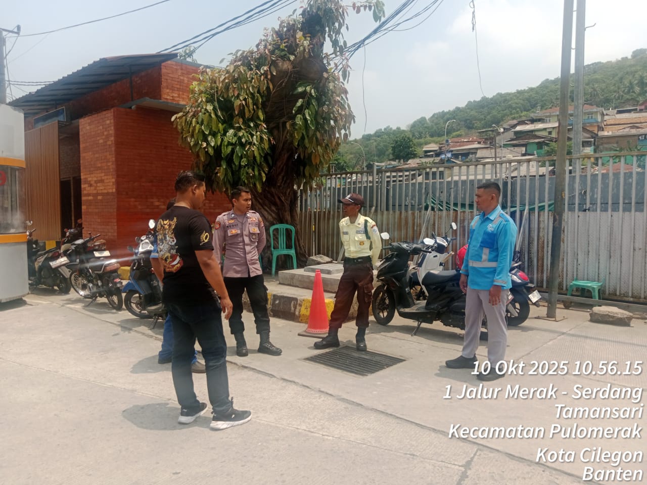 Cilegon - Personel Polsek Kskp Merak Polres Cilegon Polda Banten melaksanakan sambang dan patroli kawasan pelabuhan merak dalam rangka menjaga Harkamtibmas di Kawasan Pelabuhan Merak, Jumat (10/10/2025).