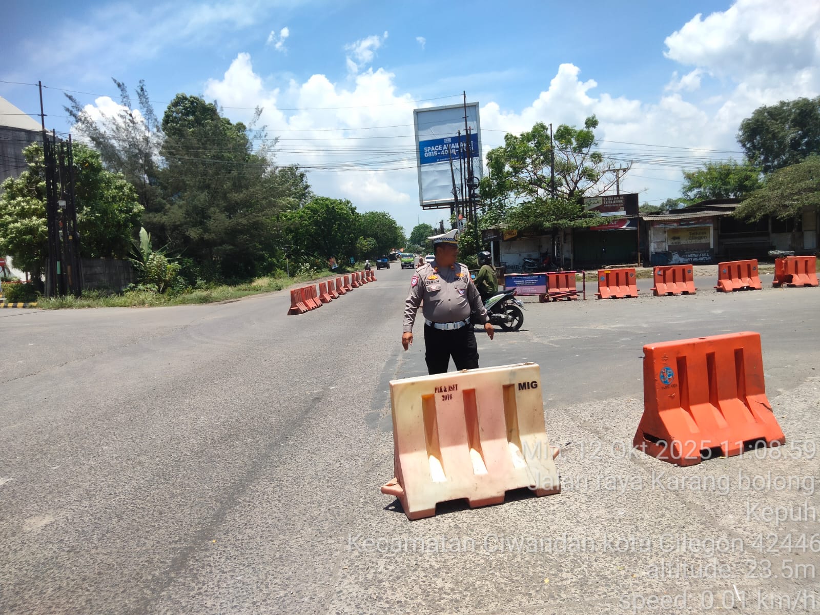 Cilegon - Personil Unit Lantas Polsek Ciwandan Polres Cilegon Polda Banten melaksanakan kegiatan monitoring jalur wisata di depan Pos Lantas JLS Ciwandan, Minggu, (12/10/2025).