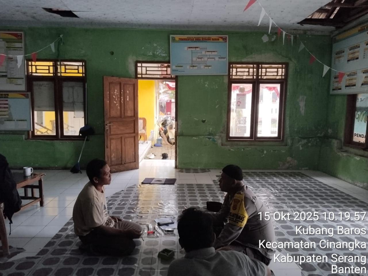 *CILEGON* dalam Rangka Mengantisipasi Gktm di wilayah Personil Bhabinkamtibmas Cinangka melaksanakan patroli Dialogis dengan Kepala Desa dan warga dan Menanyakan situasi Kamtibmas di wilayah dalam Rangka Menjaga Harkamtibmas di Desa Binaannya Kecamatan Cinangka Kab. Serang. Rabu.(15/10/2025).