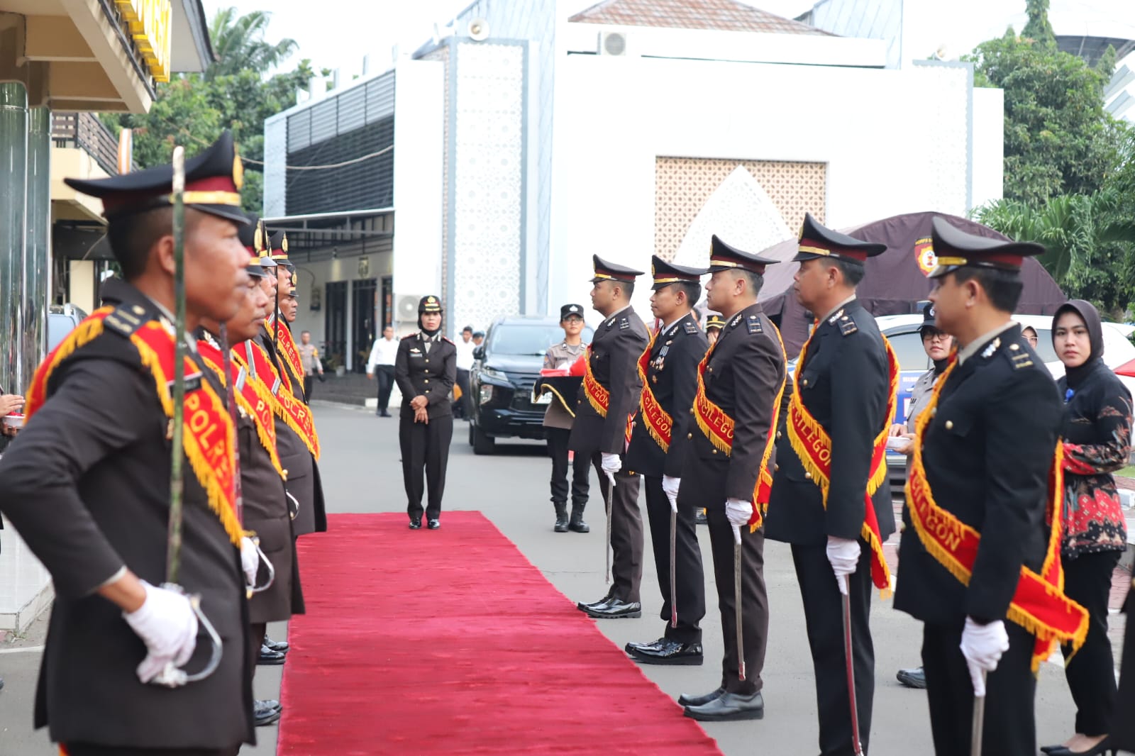 Kegiatan kemudian dilanjutkan dengan tradisi Farewell, di mana Purnawirawan Kompol Chotidjah, S.H. dilepas dengan penghormatan saat berjalan meninggalkan gerbang penjagaan Polres Cilegon. Deretan personel berdiri tegap memberikan penghormatan terakhir, sementara lantunan lagu perpisahan mengiringi langkahnya menuju babak baru dalam kehidupan setelah pengabdian panjangnya di Kepolisian.