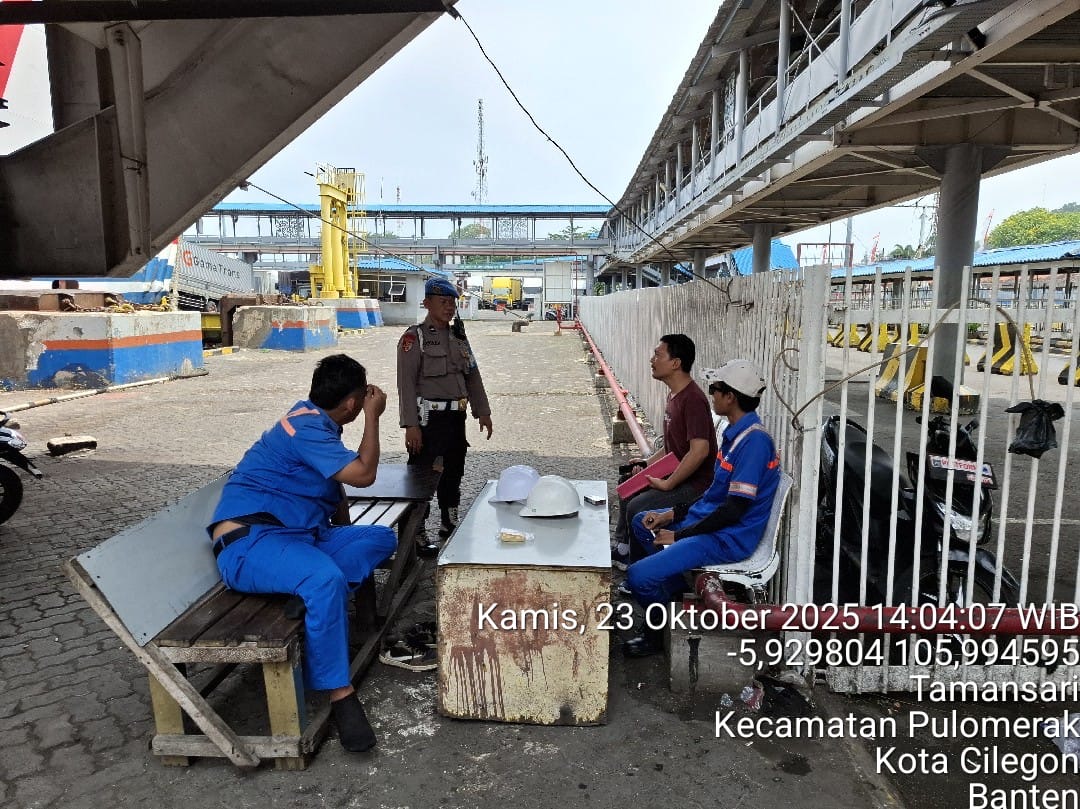 Cilegon - Personel Polsek Kskp Merak Polres Cilegon Polda Banten melaksanakan sambang dan patroli kawasan pelabuhan merak dalam rangka menjaga Harkamtibmas di Kawasan Pelabuhan Merak, Kamis (23/10/2025).