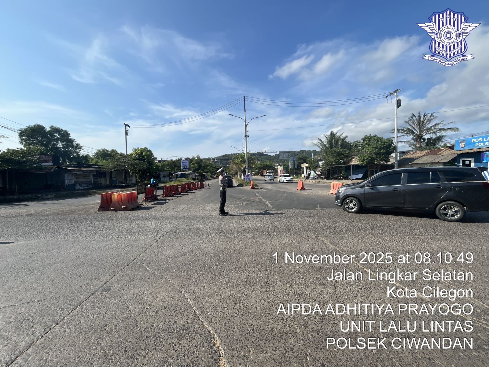 Cilegon - Personil Unit Lantas Polsek Ciwandan Polres Cilegon Polda Banten melaksanakan kegiatan monitoring jalur wisata di depan Pos Lantas JLS Ciwandan, Sabtu, (01/11/2025).