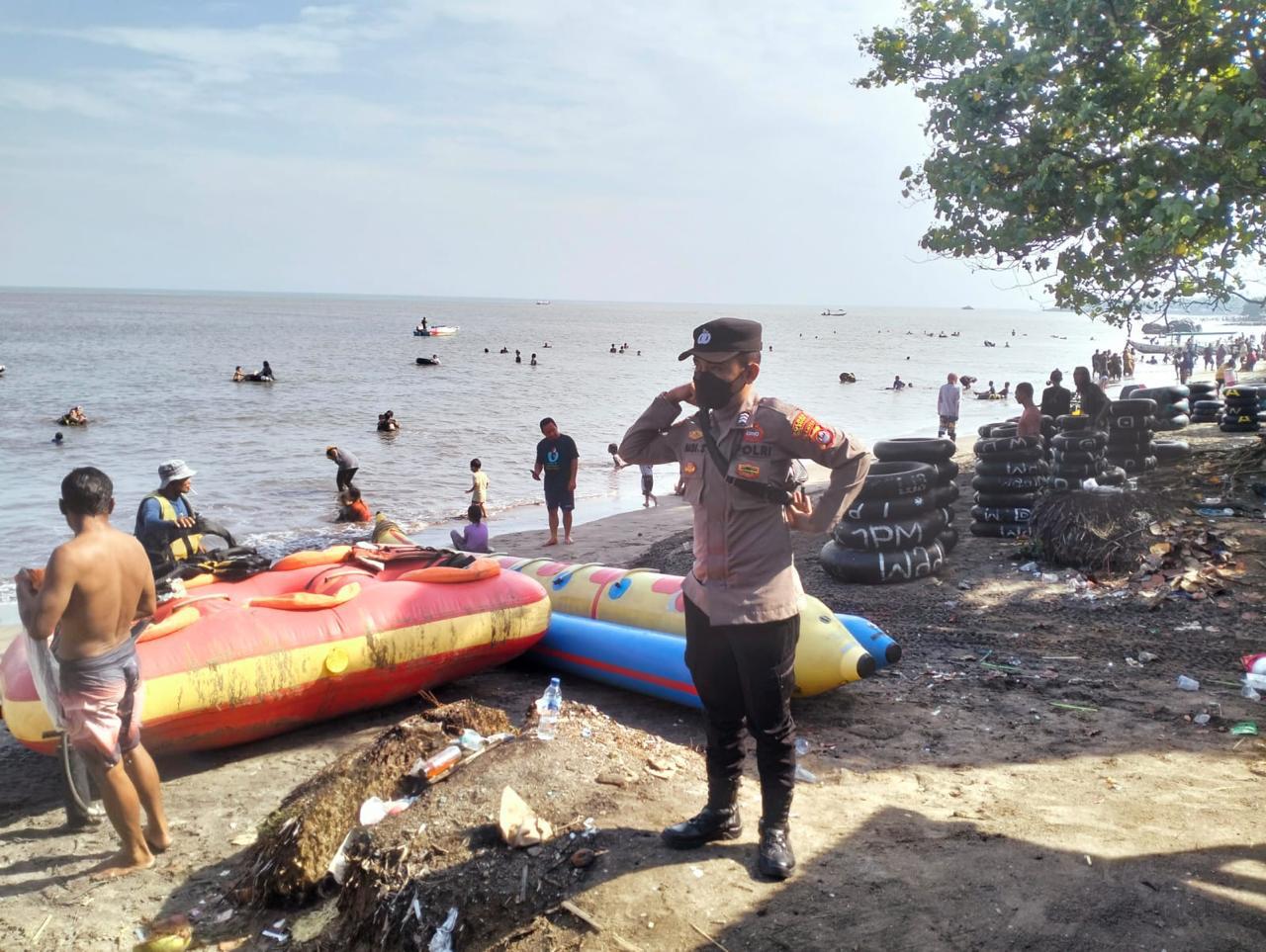 Personil Polres Cilegon Polda Banten Melaksanakan Giat Pengamanan Tempat obyek wisata di pantai Pasir Putih Anyer Kota Cilegon.
