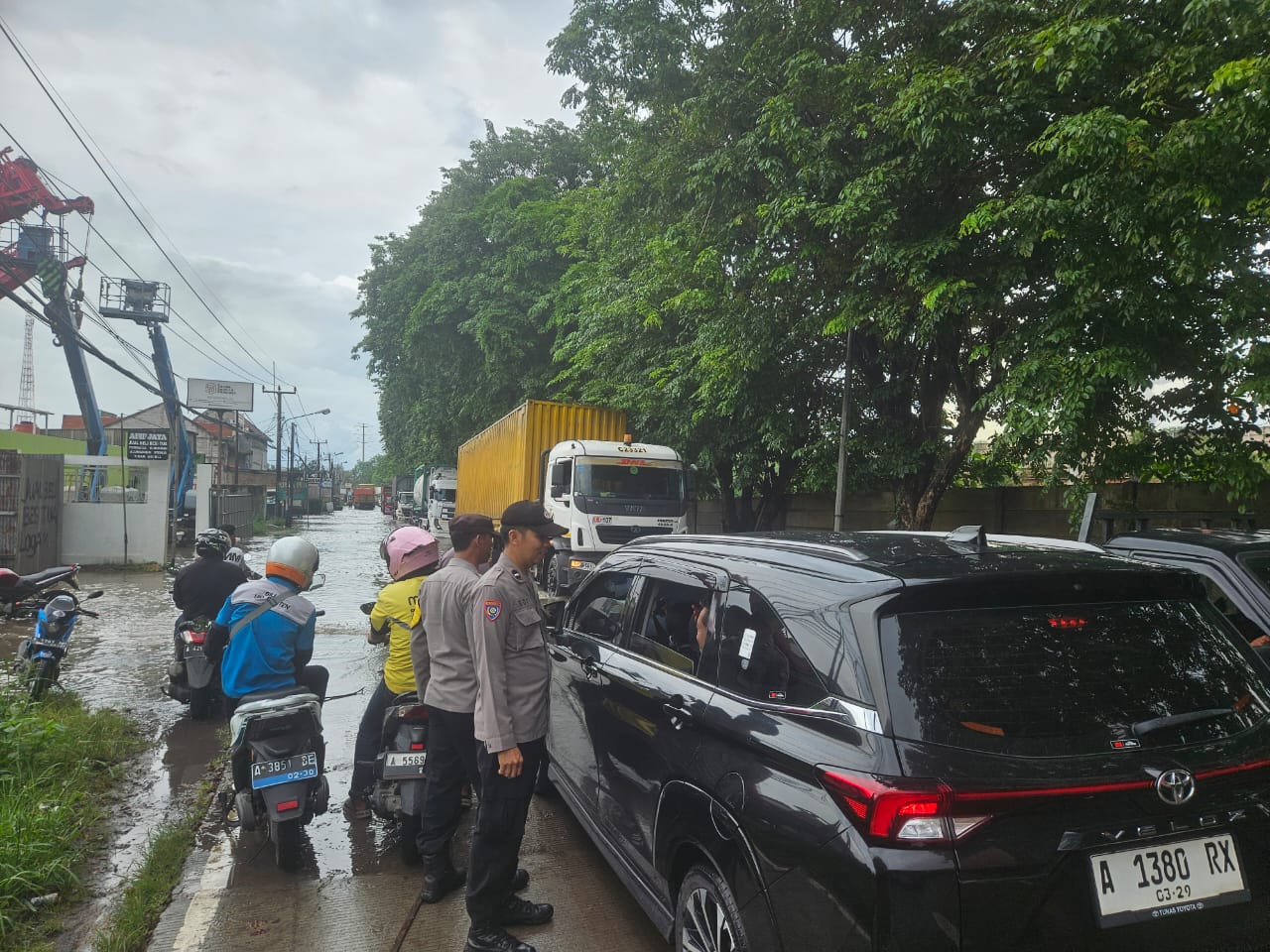 Genangan Air Setinggi 40 Cm Tutupi Jl. Raya Anyer Ciwandan, Personel Polsek Ciwandan Sigap Atur Lalu Lintas