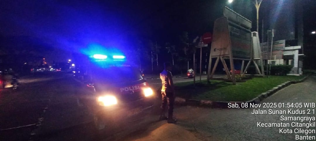 Cilegon - Personil Polsek Ciwandan Polres Cilegon Polda Banten Dalam Pelaksanaan Kegiatan Patroli dengan menyalakan lampu rotator berwarna biru di Daerah Hukum Polsek Ciwandan Polres Cilegon Polda Banten dari malam hingga dini hari, dalam rangka menciptakan situasi aman dan kondusif, Sabtu (08/11/2025).