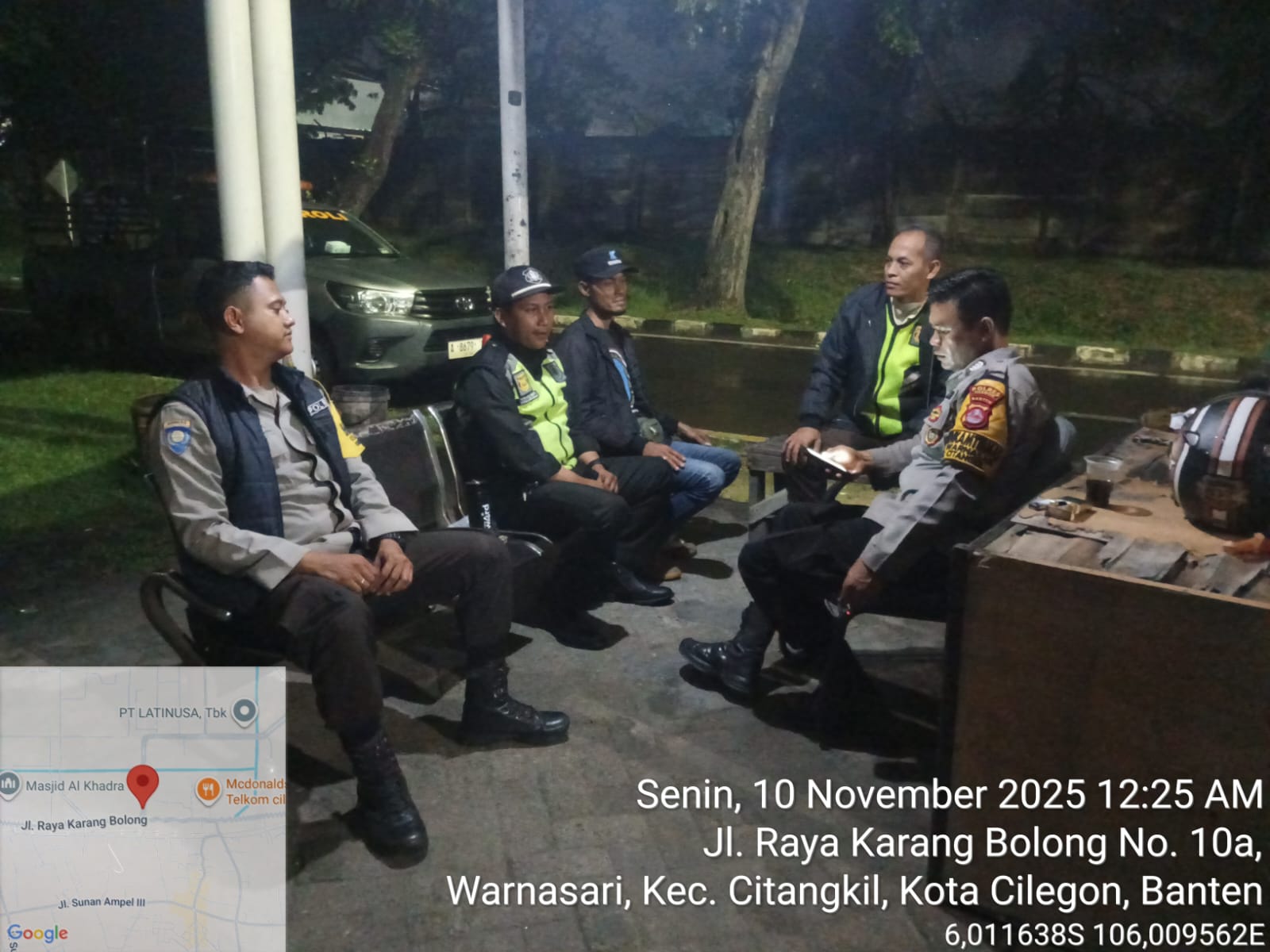 Bhabinkamtibmas Polsek Ciwandan memberikan pengarahan dan pembinaan kepada anggota Security yang sedang melaksanakan tugas jaga, agar lebih meningkatkan Pengecekan dan Patroli dalam rangka memelihara Keamanan dan Ketertiban Masyarakat di lingkungannya.