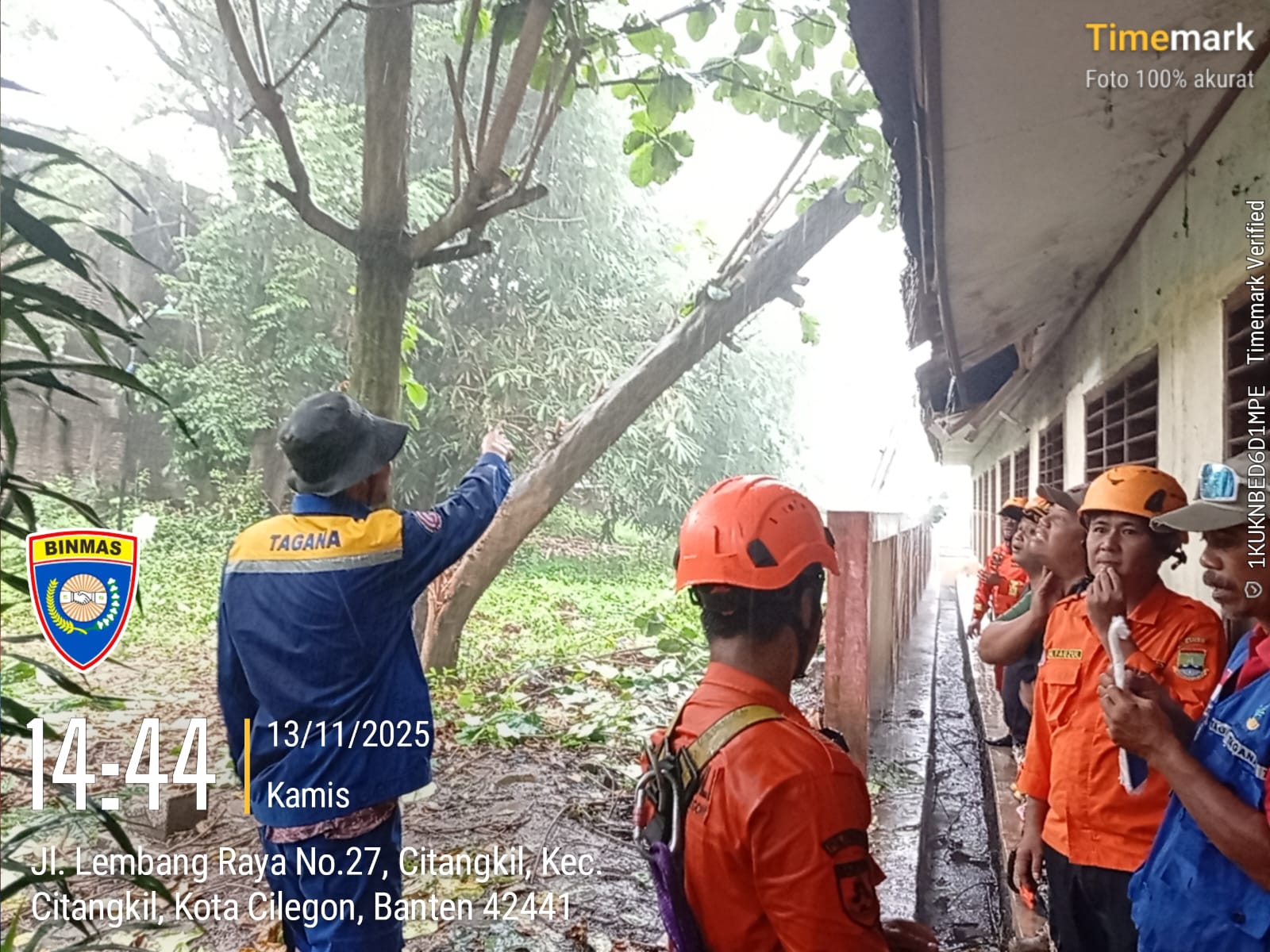 Cilegon -  Pohon ketapang tumbang dan menimpa gedung SDN Tegal Cabe, Lingkungan Tegal Cabe RT 04/02, Kelurahan Citangkil, Kecamatan Citangkil, Kota Cilegon, Kamis (13/11/2025).