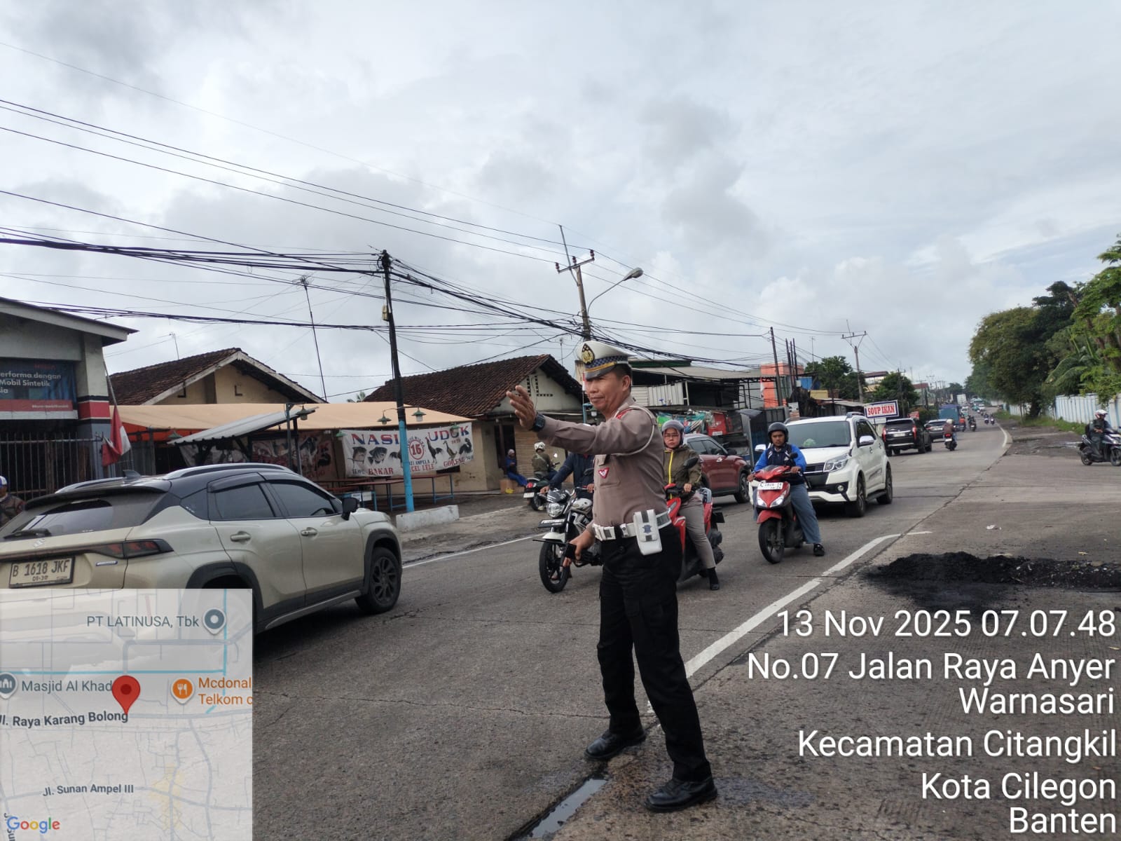 Cilegon - Guna Kelancaran Lalu-lintas Personil Unit Lantas Polsek Ciwandan Polres Cilegon Polda Banten melaksanakan pengaturan lalu-lintas di Simpang Beringin Ciwandan Pertigaan Kawasan Industri KSP/ KIEC I  kelurahan Warnasari Kecamatan Citangkil Kota Cilegon, Kamis (13/11/2025).