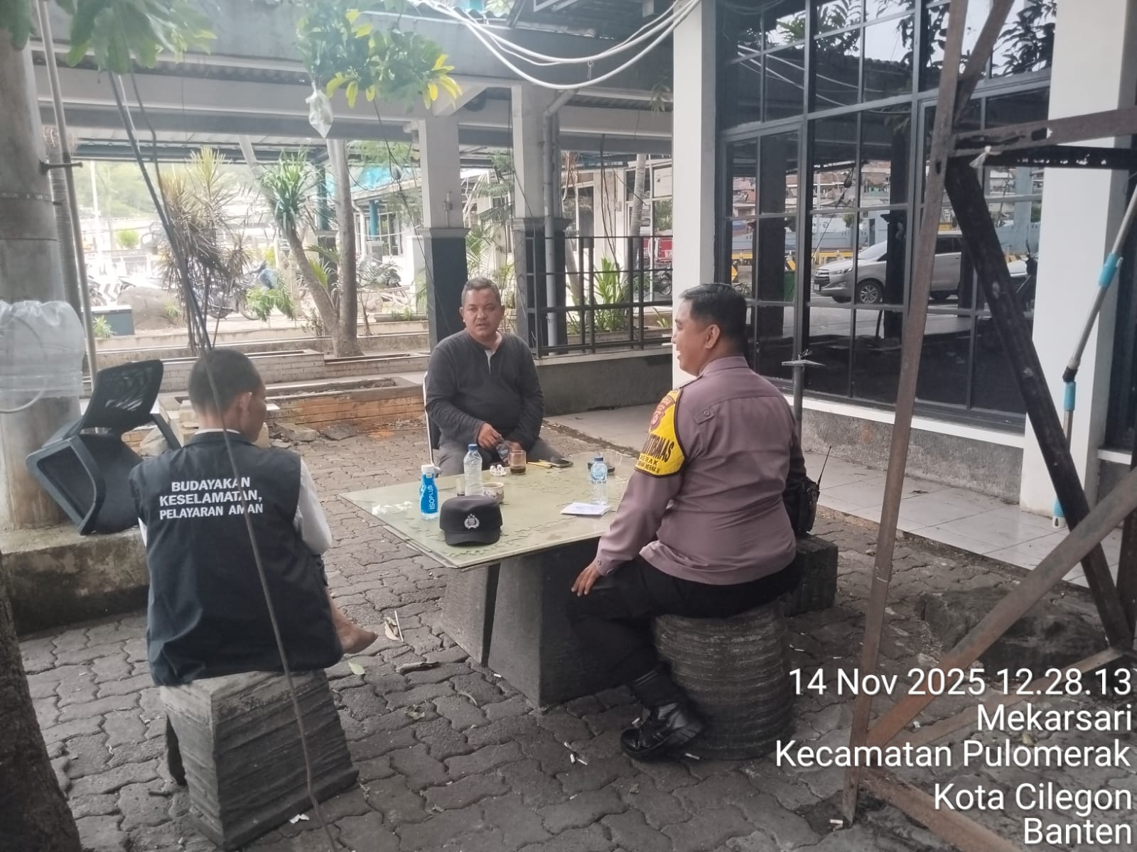 Cilegon - Personel Polsek Kskp Merak Polres Cilegon Polda Banten melaksanakan sambang dan patroli kawasan pelabuhan merak dalam rangka menjaga Harkamtibmas di Kawasan Pelabuhan Merak, Jumat (14/11/2025).