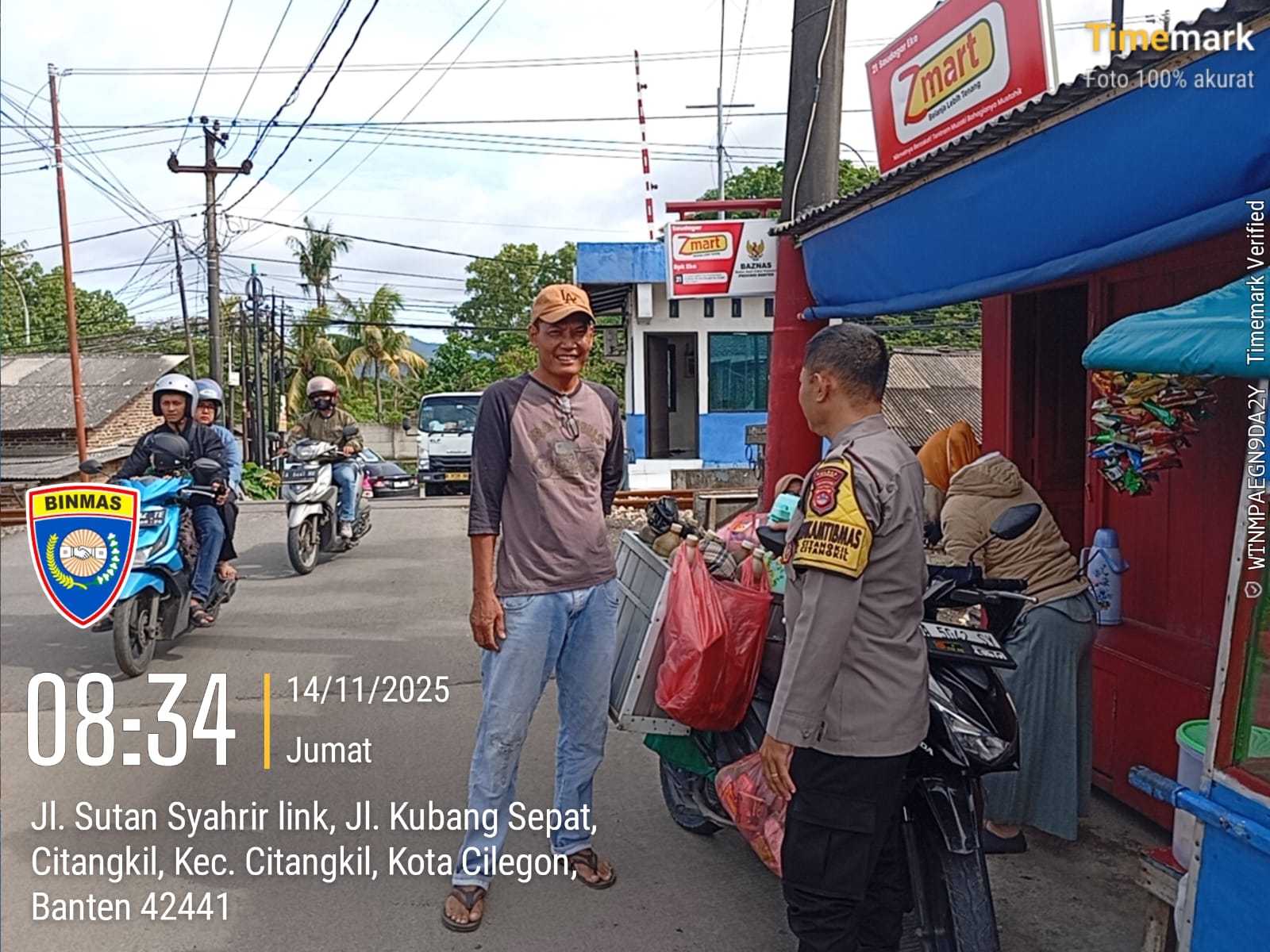 Cilegon – Bhabinkamtibmas Polsek Ciwandan Selalu Hadir Di Setiap Kegiatan warga binaanya merupakan salah satu tugas rutin Bhabinkamtibmas, yakni dengan melaksanakan kunjungan kepada masyarakat binaannya untuk menjalin silaturahmi yang lebih erat dan menyampaikan pesan-pesan kamtibmas serta mencari informasi yang berkembang di masyarakat agar tercipta situasi kamtibmas yang aman dan kondusif, Sabtu (15/11/2025).