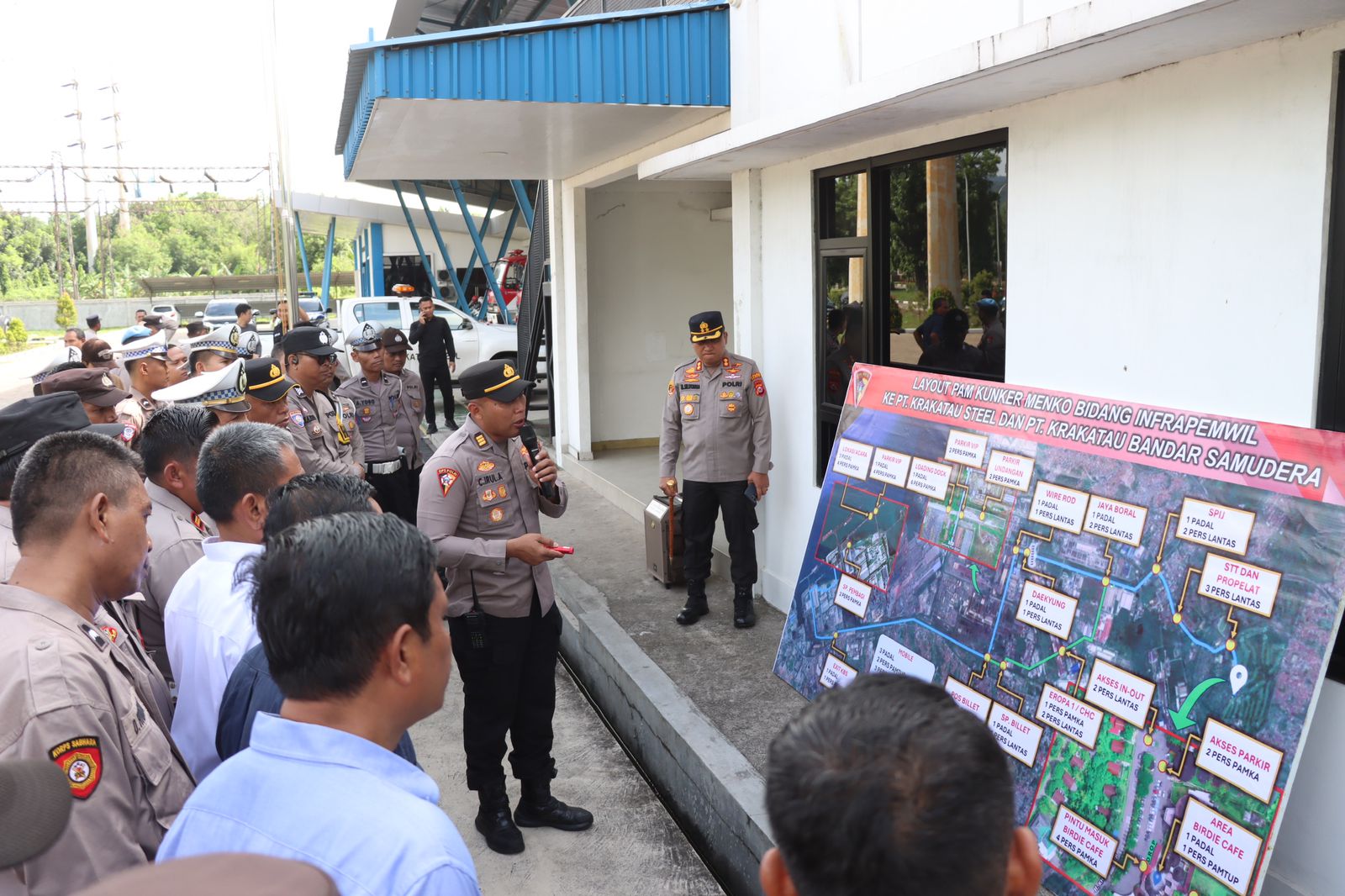 Polres Cilegon melaksanakan pengamanan kegiatan Kunjungan Kerja Menteri Koordinator Bidang Infrastruktur dan Pembangunan Kewilayahan RI, Agus Harimurti Yudhoyono, ke PT Krakatau Steel serta Pelabuhan PT Krakatau Bandar Samudra.