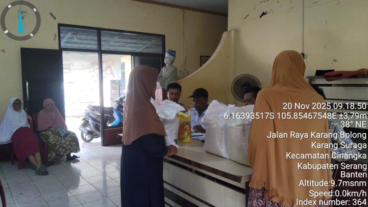 *Polres Cilegon* - Bhabinkamtibmas Desa Karagsuraga Polsek Cinangka Polres Cilegon Polda Banten Bripka Oki Berikan Pengamanan, Monitoring dan Kawal Pelaksanaan Penyaluran Bantuan Pangan Non Tunai Dari Badan Pangan Nasional Di Aula kantor Desa Karangsuraga kecamatan Cinangka Kab Serang, Kamis (20/11/2025).